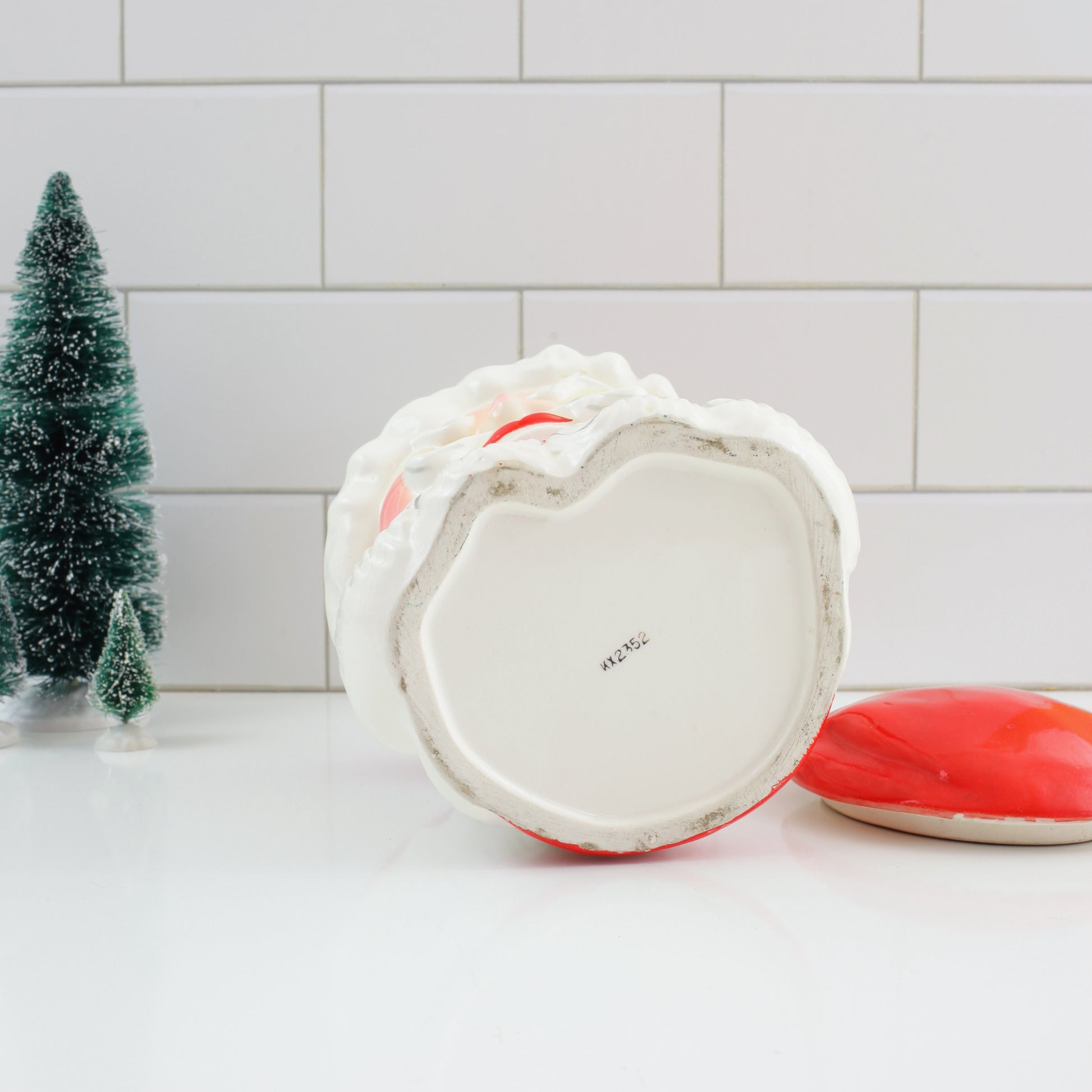 ➝ In fantastic condition! No chips, cracks, or repairs. Colors are bright and vivid. A few light crazing lines in the surface glaze. Minor wear to red paint around both the rim of the base and the lid, as well as a bit of wear to the back of Santa's hat - shown in last two photos. Hard to find this particular cookie jar, and even harder to find it in such wonderful condition!