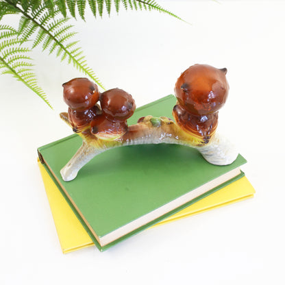 This absolutely adorable vintage 1960s ceramic owl figurine is a real hoot! Made by Norcrest, this cute piece has such great details - from the branch full of acorns to the sweet expression on each owl's face. Perfect for adding a bit of kitschy vintage fun to your tabletop or shelf, these little owls are sure to make you smile!