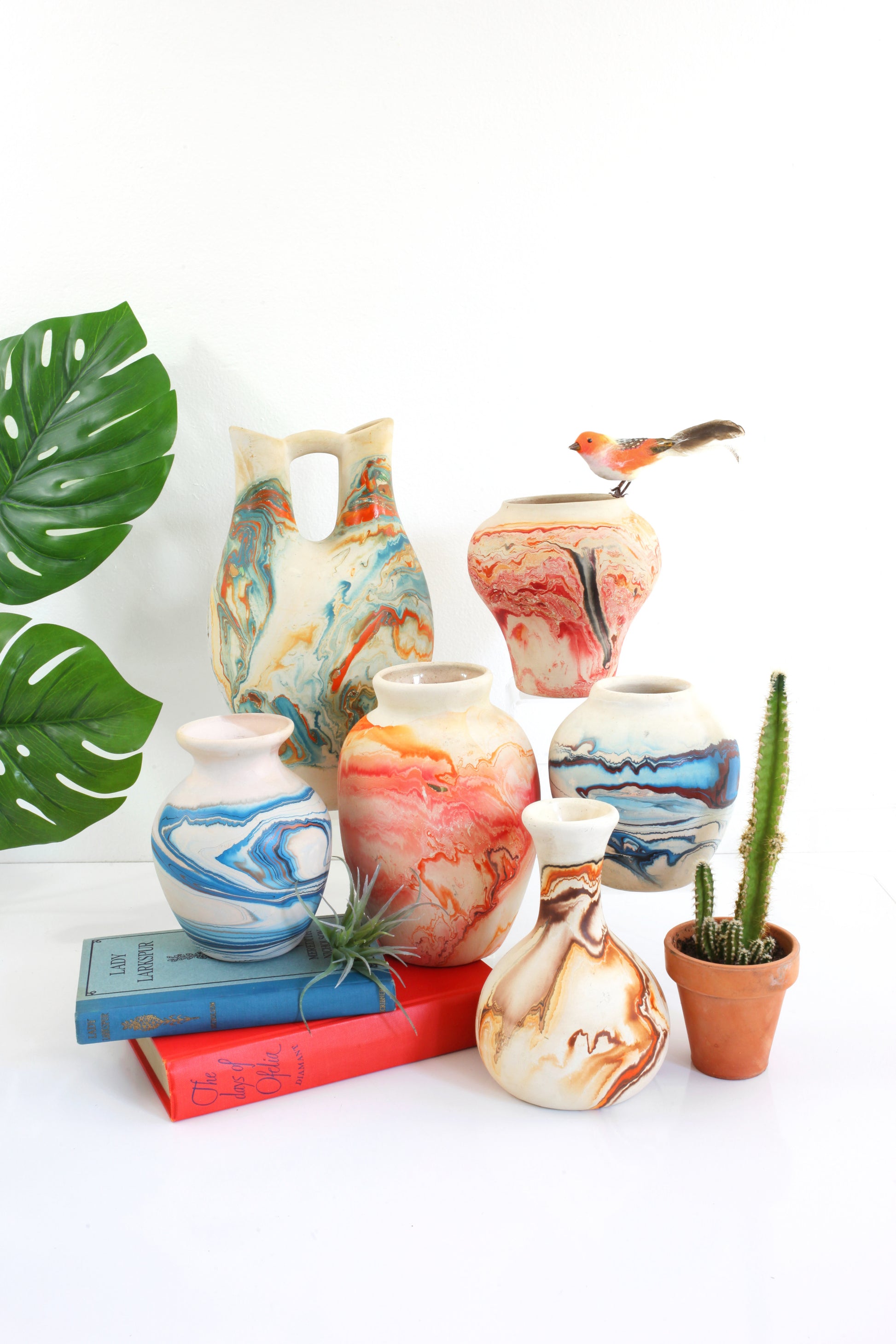 This absolutely gorgeous hand made Nemadji pottery vase is a real stunner! Made of off-white clay with a striking marbleized swirl pattern in rich, saturated hues of orange with a few pops of deep black. The matte finish gives this piece such a warm, earthy feel, and really helps those swirling colors pop. Inside of vase is glazed. A truly beautiful one-of-a-kind piece!