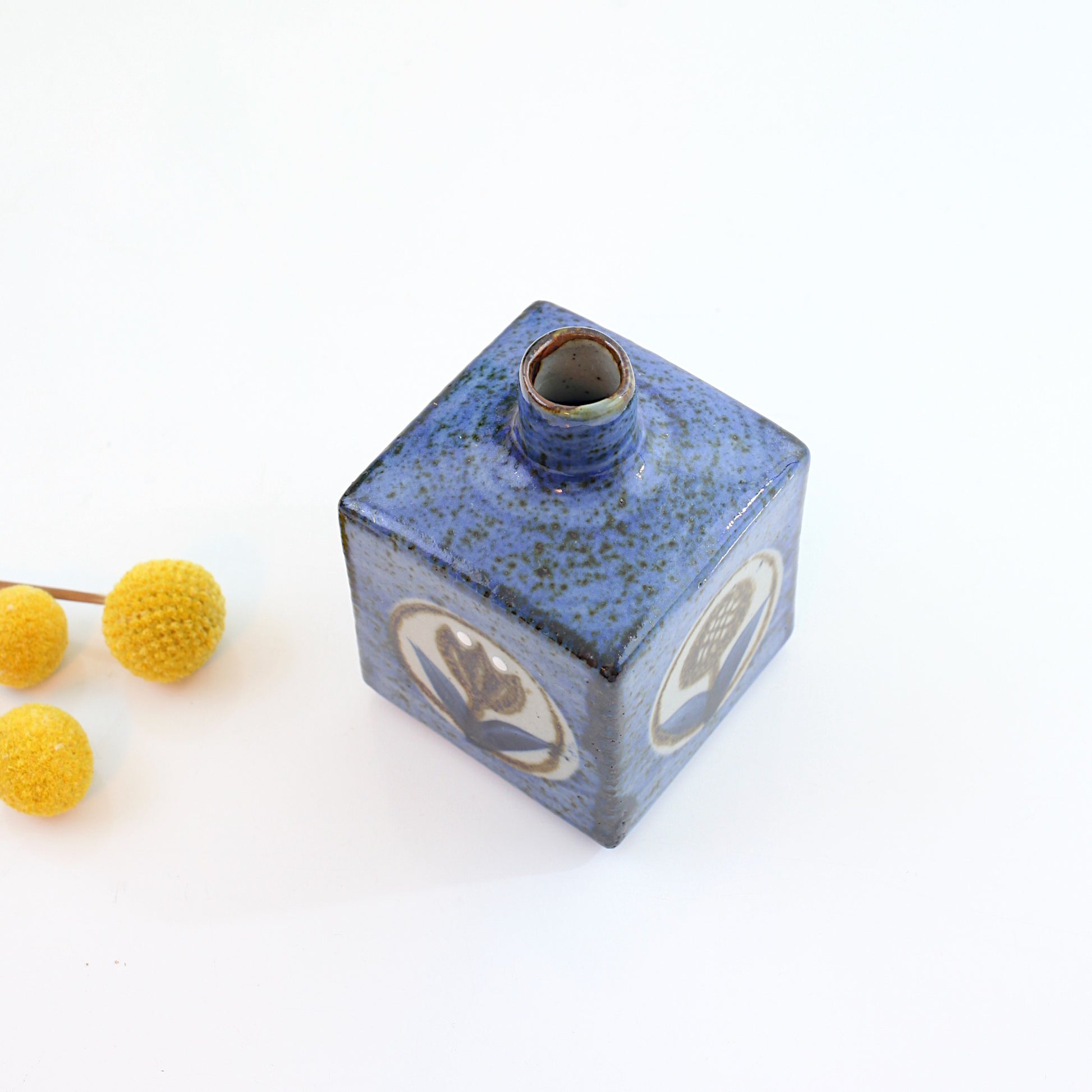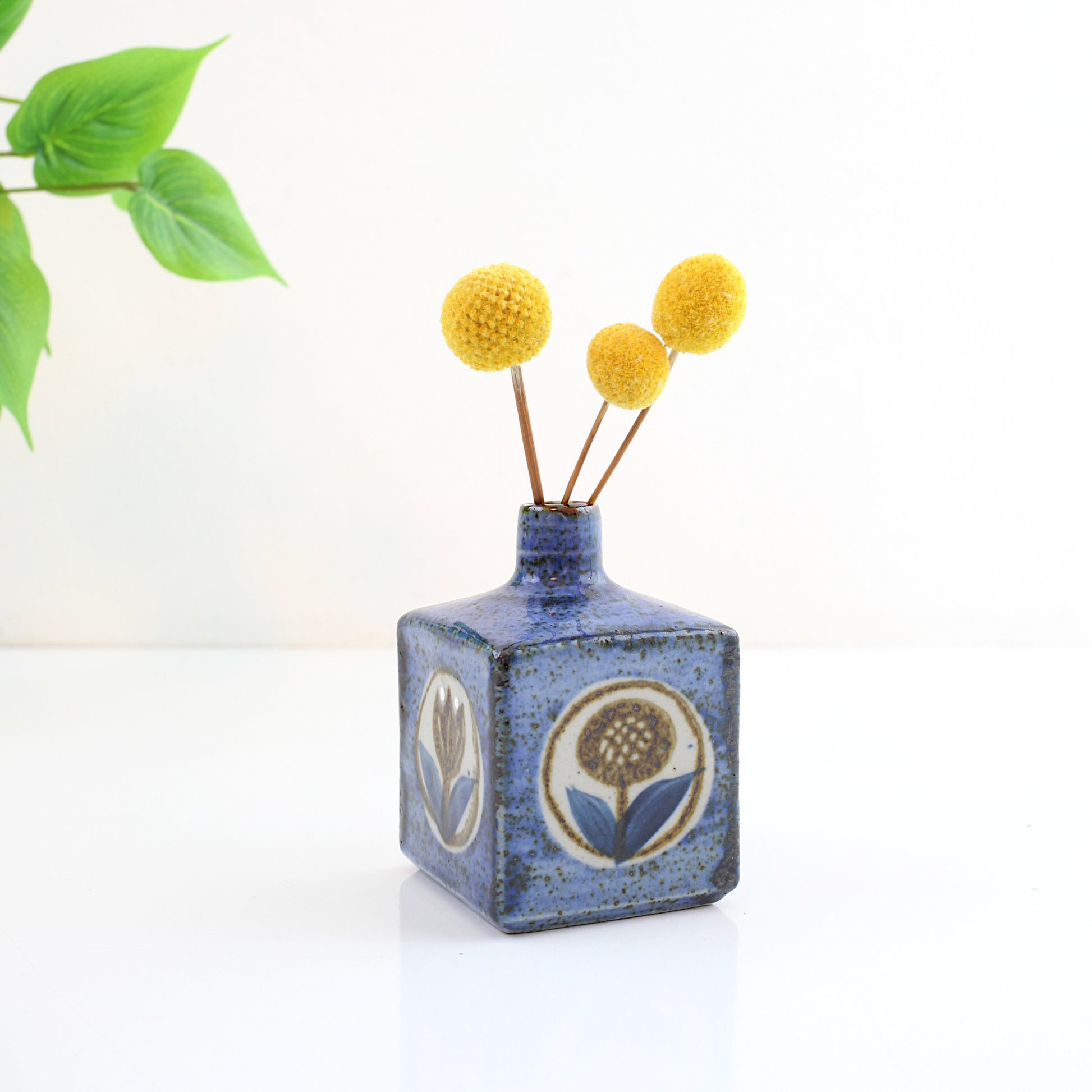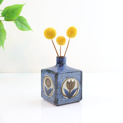 This beautiful mid century stoneware vase by OMC Japan is so simple and lovely. Made by hand of sturdy stoneware with a gorgeous squared mid century shape, this vase has beautiful hand-painted flowers on each side. Perfect for holding a few blooms or blossoms, and pretty enough just to display and admire!