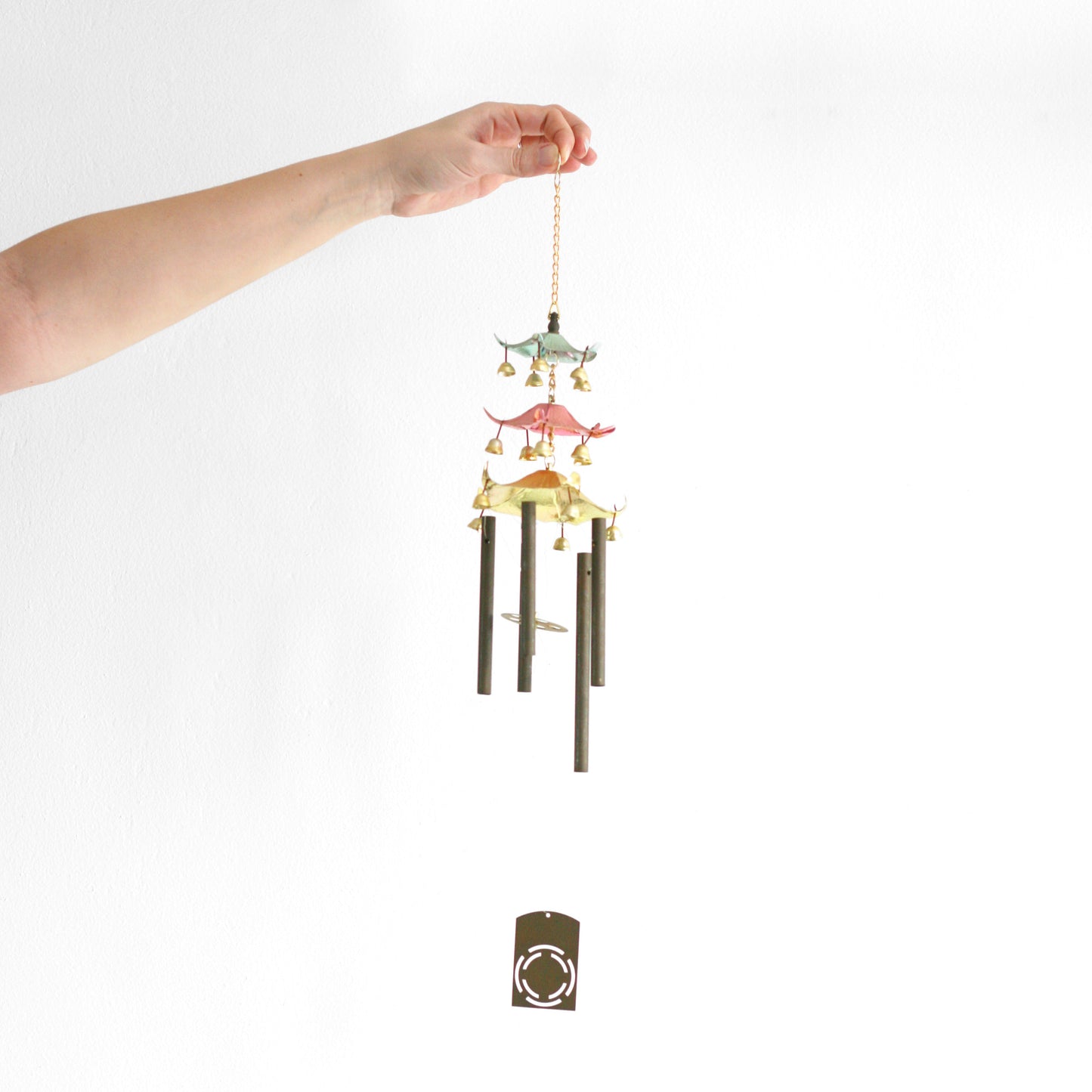 This sweet vintage 1950s Asian pagoda wind chime is so retro and fun! Each of the three pastel roofs are made of aluminum and decked out with tiny brass bells. Chimes are made of brass with a beautiful patina. This cheerful chime even comes with its original box, which has fantastic retro colors and fonts. A beautiful addition to your garden or porch, this wind chime is sure to make you smile!