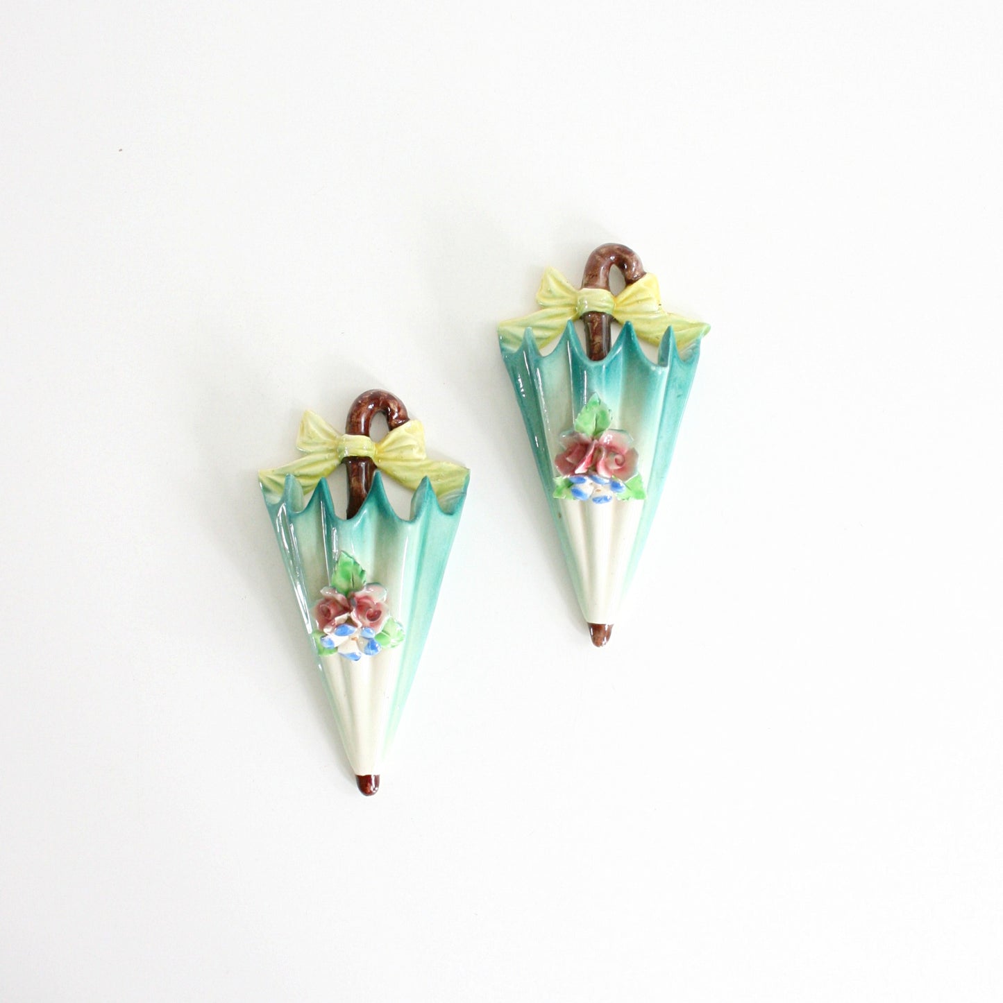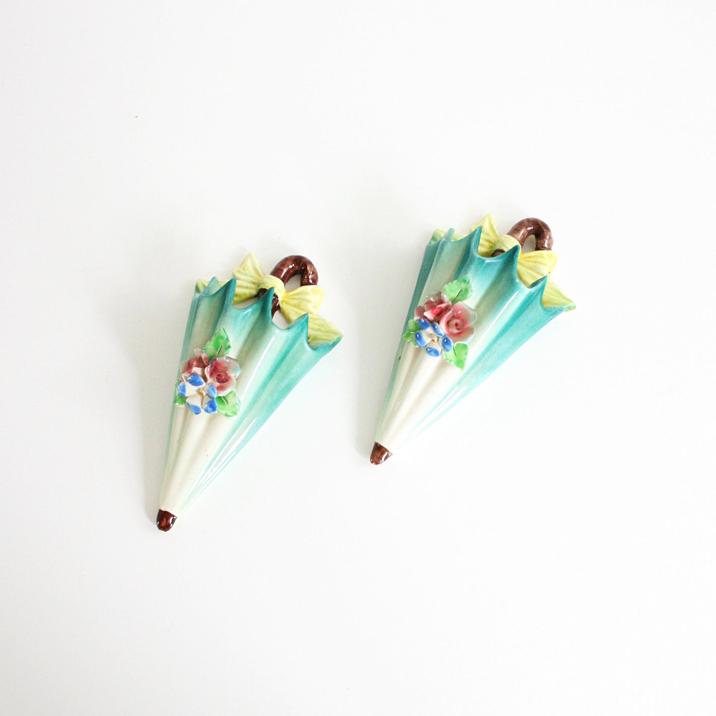 This absolutely adorable pair of vintage 1950s umbrella wall pockets from Italy is so sweet and spring-y! Made of ceramic and painted in gorgeous, rich shades of pastel greens, yellows, and pinks, these pretty parasols are decorated with ceramic flowers and a bright yellow bow around each handle. Perfect for holding flowers, plants, or whatever you please, these pretty little pockets are sure to make you smile!