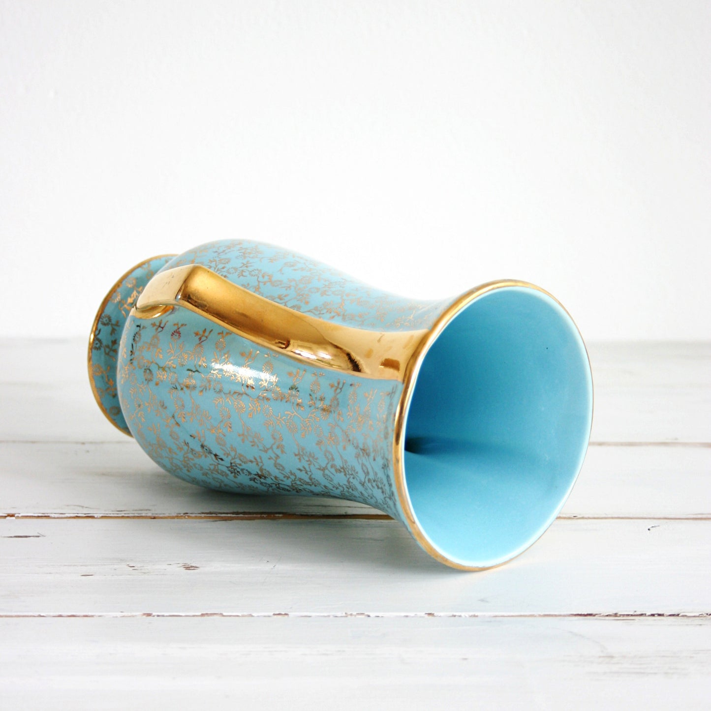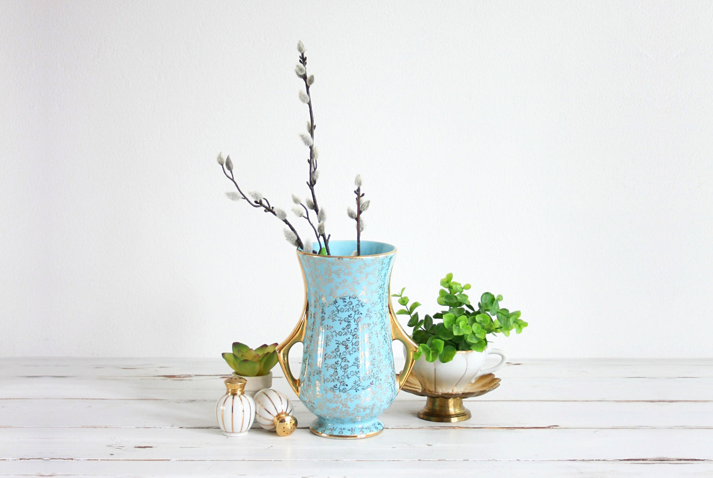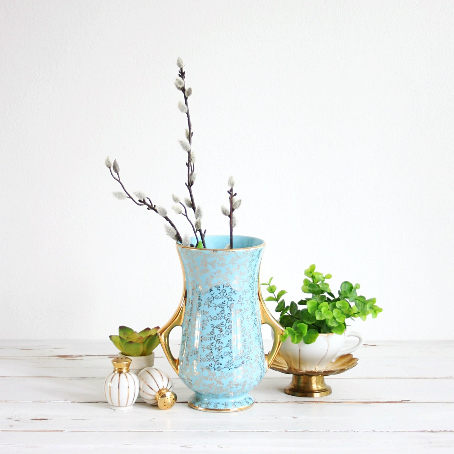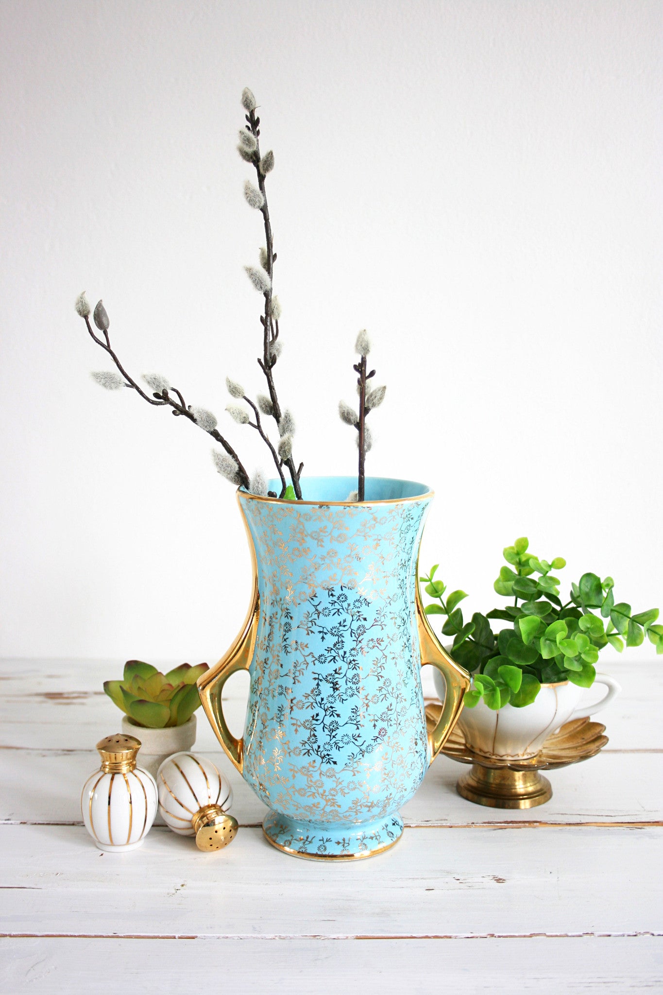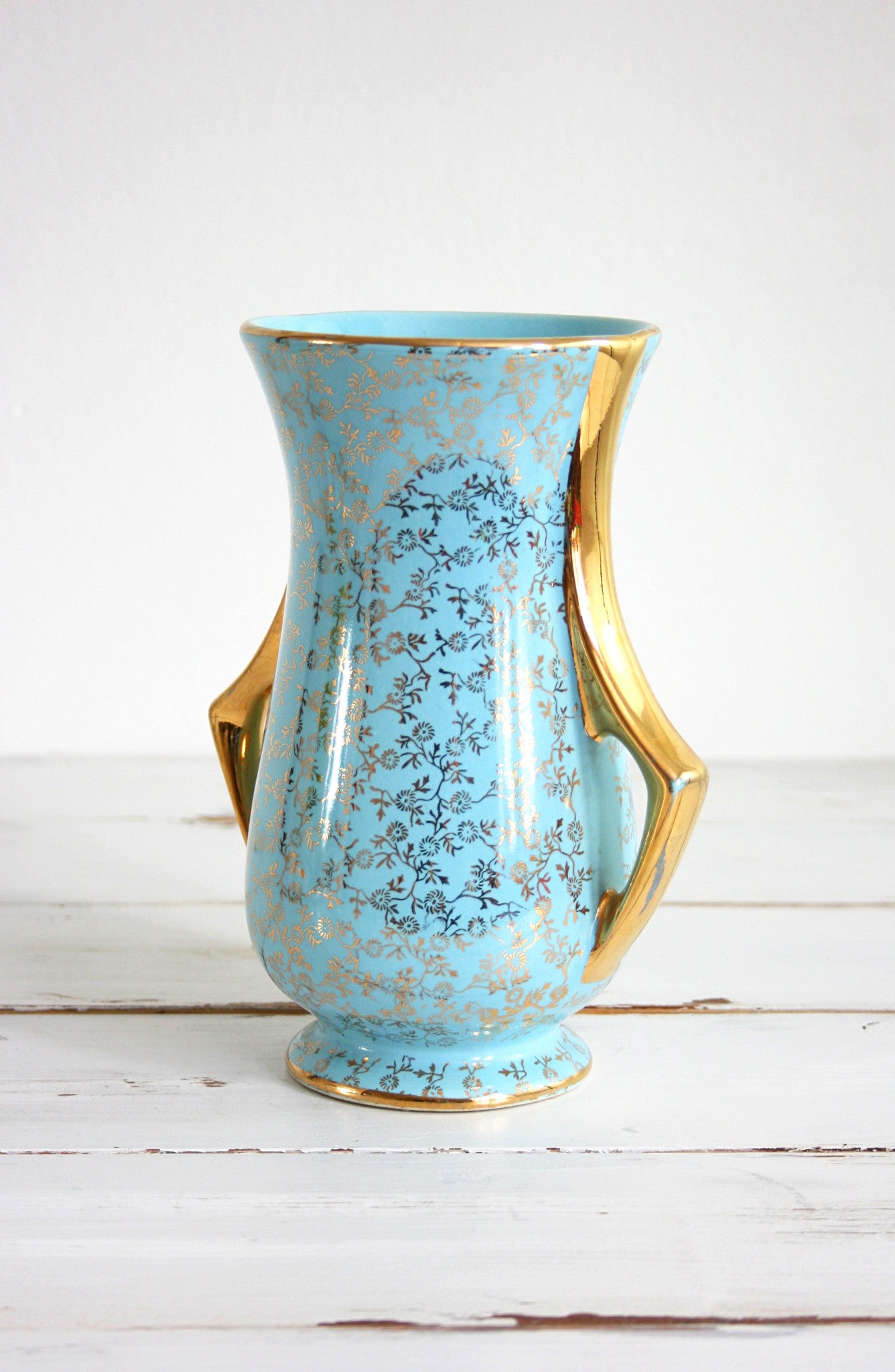 This beautiful vintage aqua blue and gold vase is so bright and beautiful! Manufactured by the Pearl China Co. in the late 1950s or early 1960s, this two-handled vase is a gorgeous shade of bright aqua blue with 22 K gold detailing. Perfect for holding a bunch of spring blooms, and pretty enough just to display and admire!