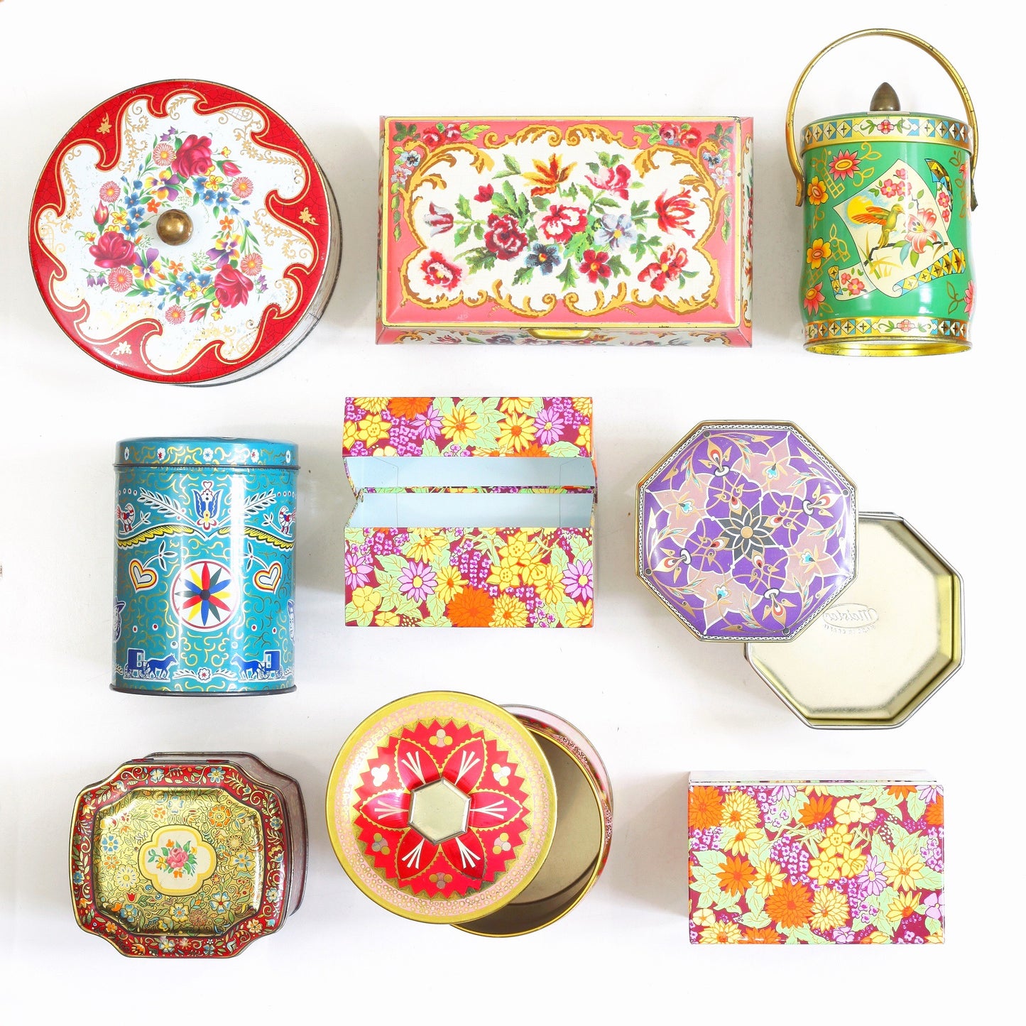 This bright and oh-so beautiful vintage tin is just so sweet! Made in Holland, this tin features colorful floral designs, a shiny golden interior, and closes with a hinged lid. Perfect for stashing craft supplies, storing cookies and snacks - or whatever you can dream up! This tin is so cheerful and pretty, you'll be looking for reasons to use it all over your house!