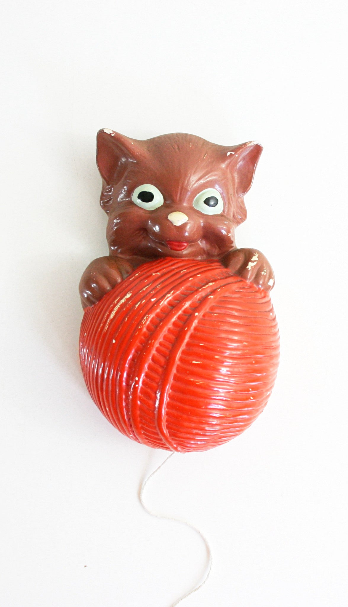 SOLD - Vintage Plaster Kitten String Holder / 1940s Chalkware Cat String Dispenser