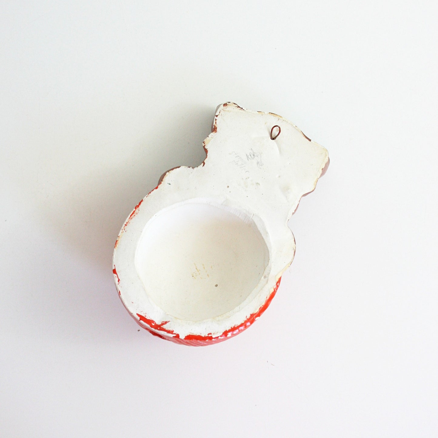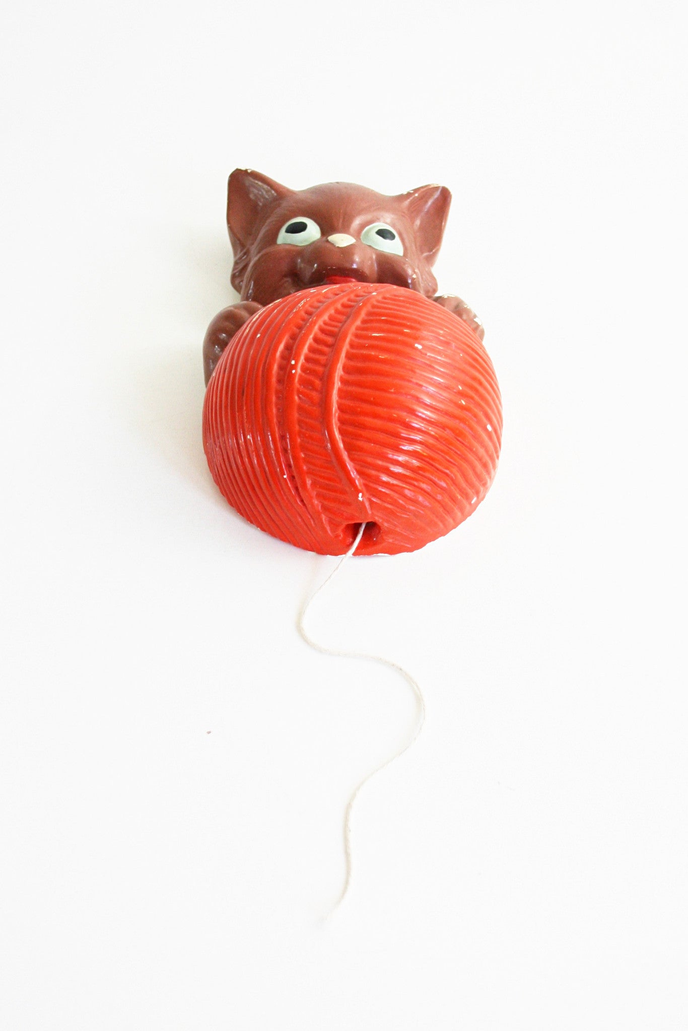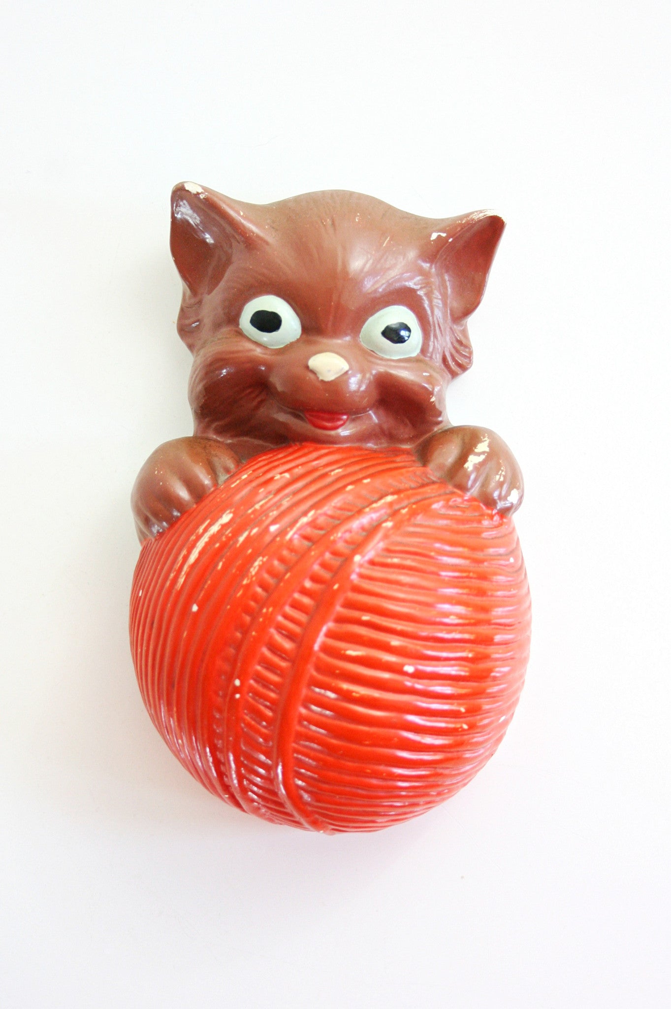 This paw-sitively adorable vintage plaster kitten string holder is so colorful and fun! Made of chalkware or plaster, this 1940s string dispenser is as useful as it is sweet. A metal loop on top makes it easy to hang, and a hollow back provides the perfect place to stash string or baker's twine. Great for the kitchen, craft room, and everywhere in between!