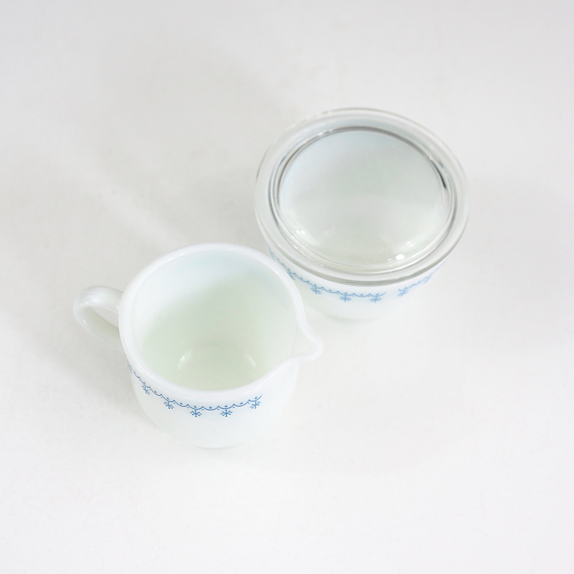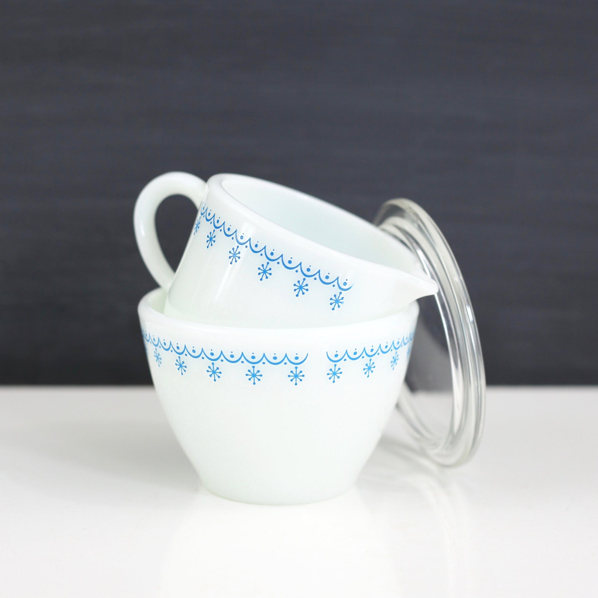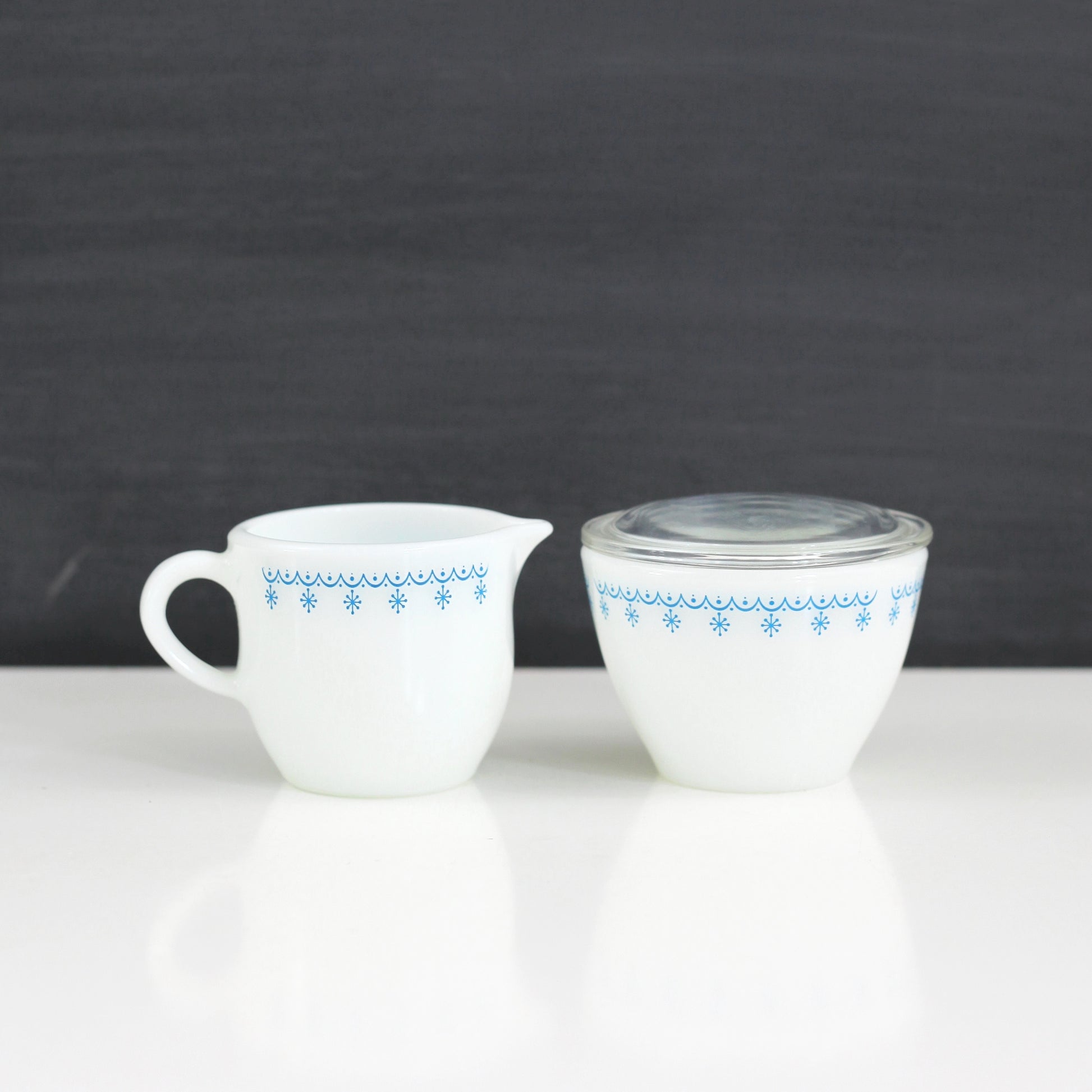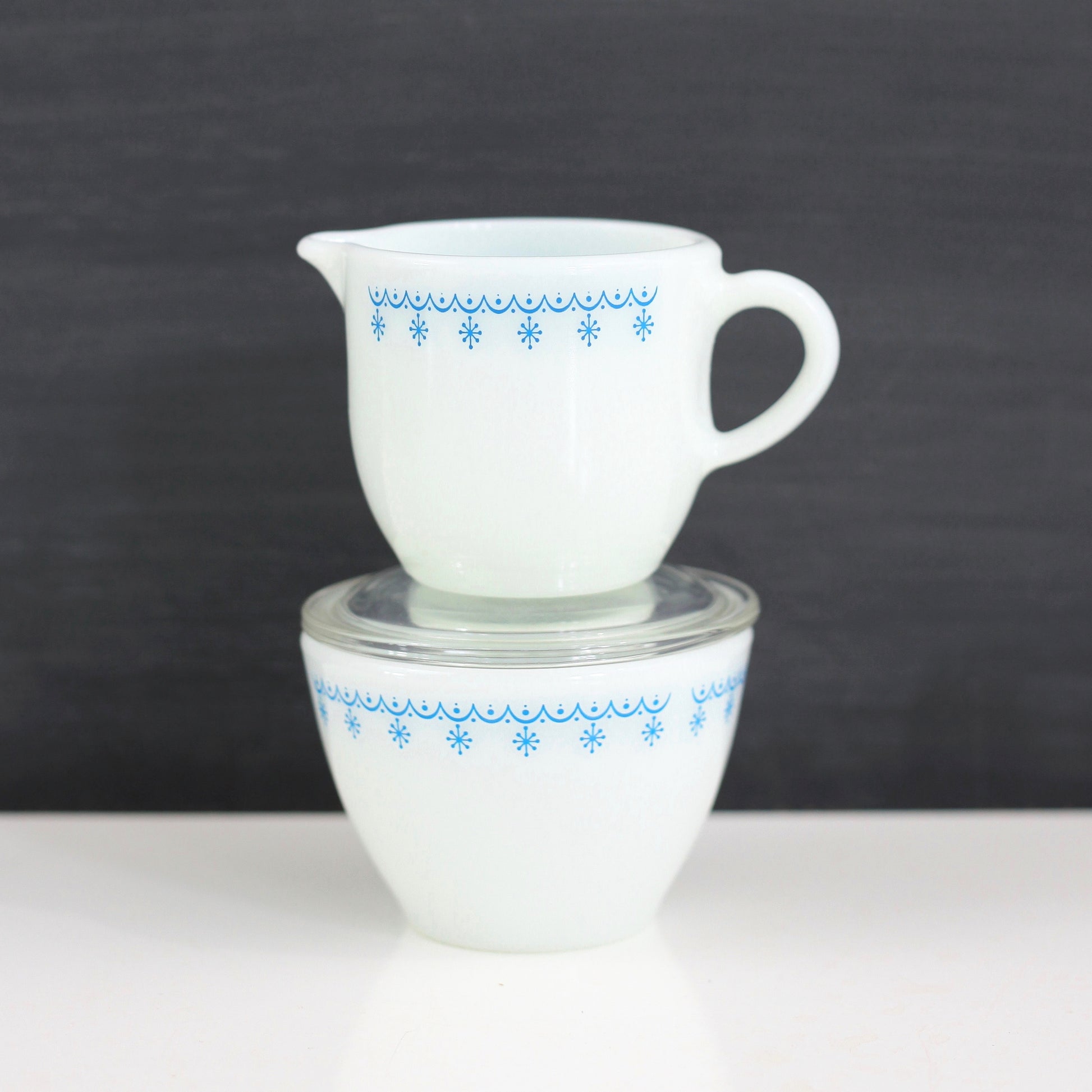 This sweet vintage milk glass cream and sugar set by Pyrex and Corning is just too cute! Made of thick, sturdy milk glass, each piece features a sweet retro design of blue scallops and star bursts, officially called the 'Garland' pattern. Perfect for adding a bit of retro charm to your kitchen or table!