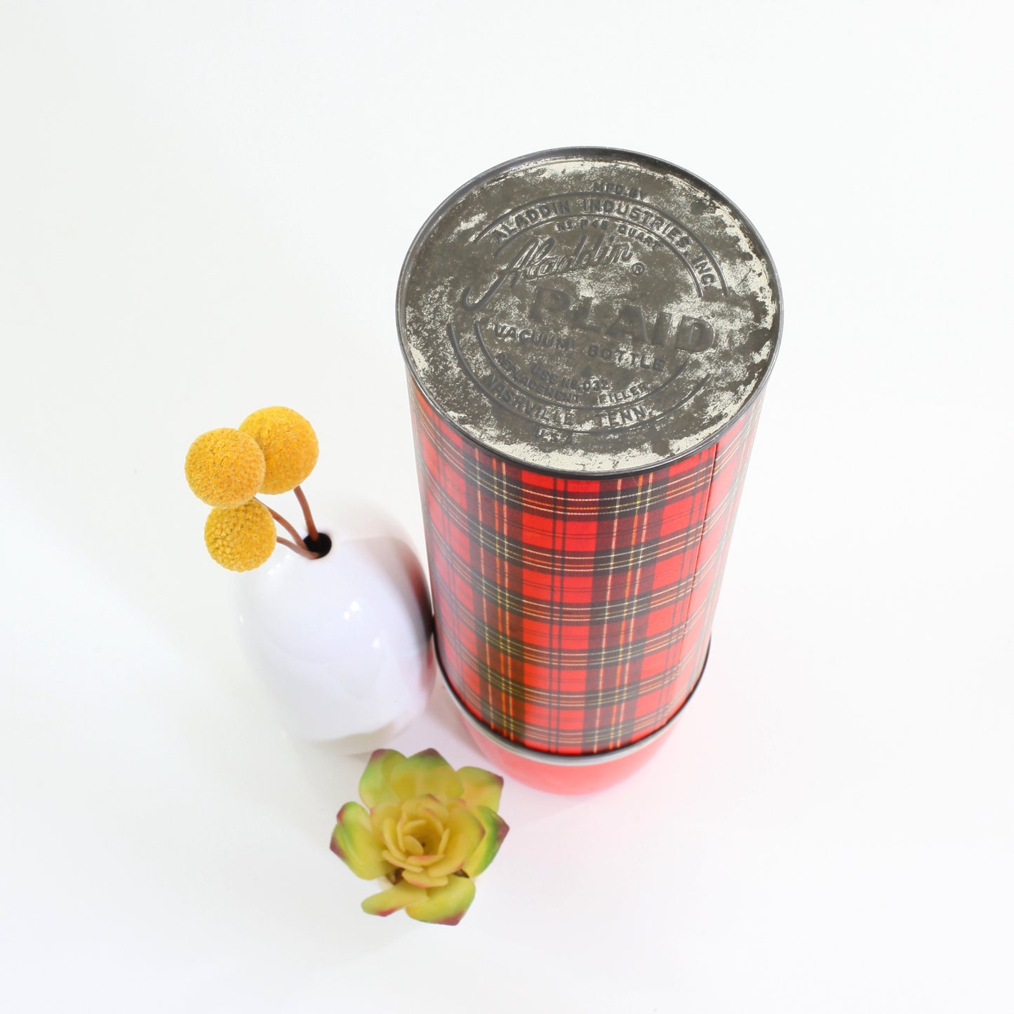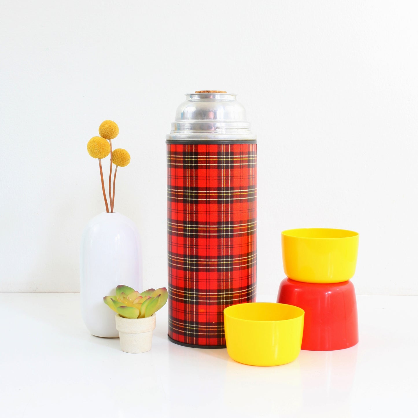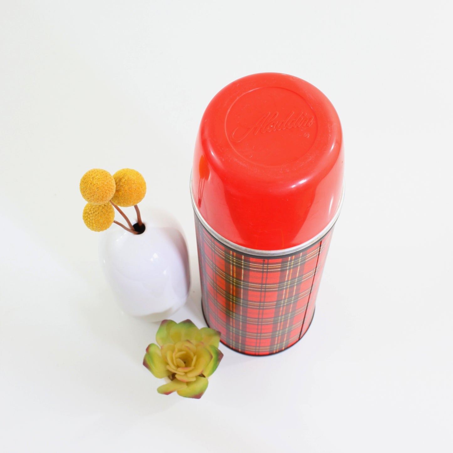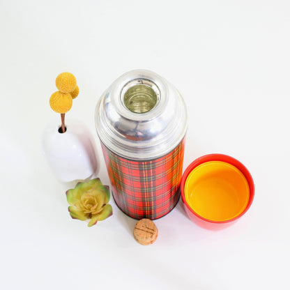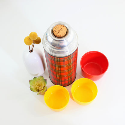 This fantastic vintage thermos is just full of retro charm! Made by Aladdin in the 1960s, this metal-body thermos features a gorgeous red, black, and yellow plaid pattern with bright red plastic cap (with two more yellow cups nested inside). Perfect for a hot cup of cocoa or an icy cold drink, and pretty enough just to display and admire!