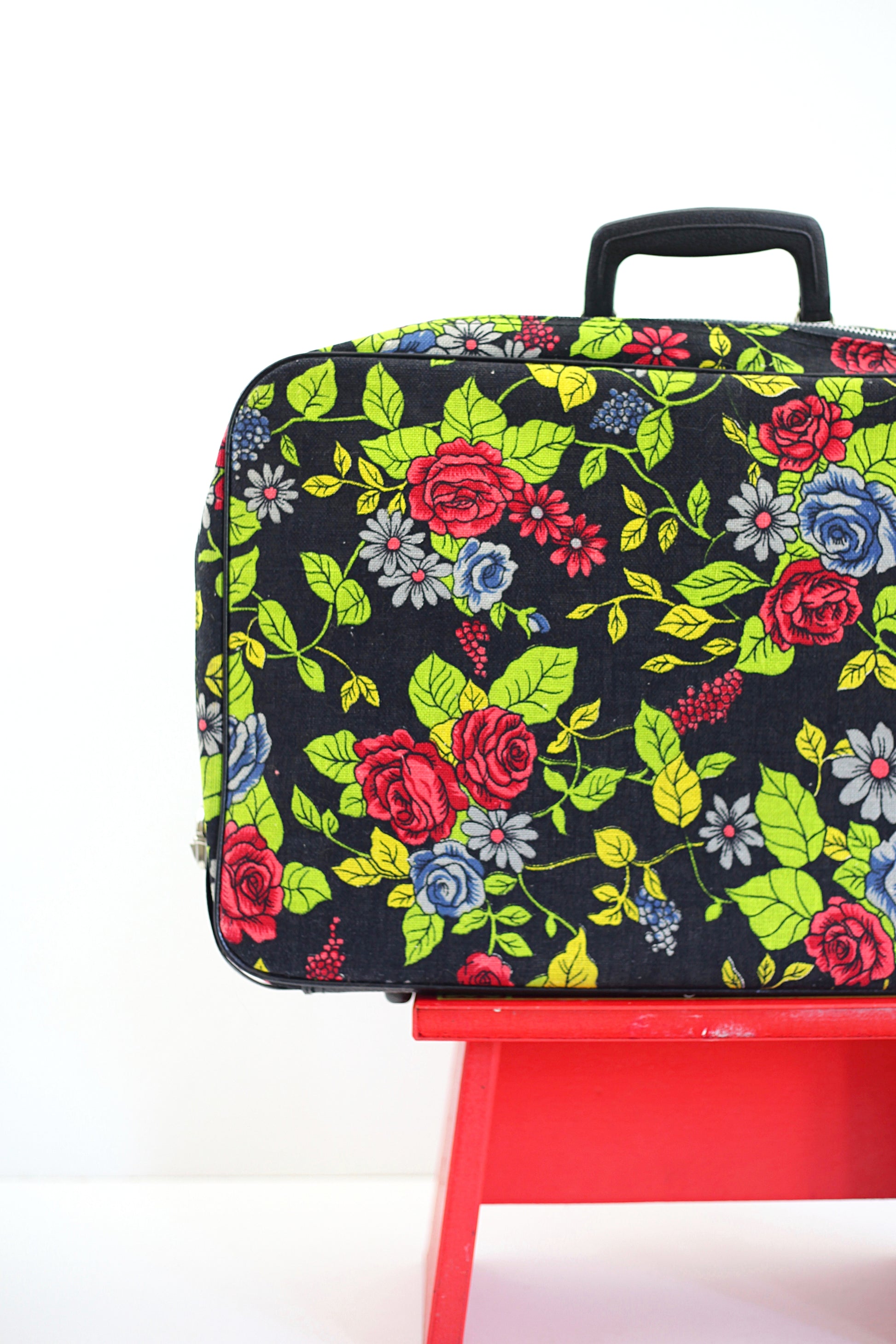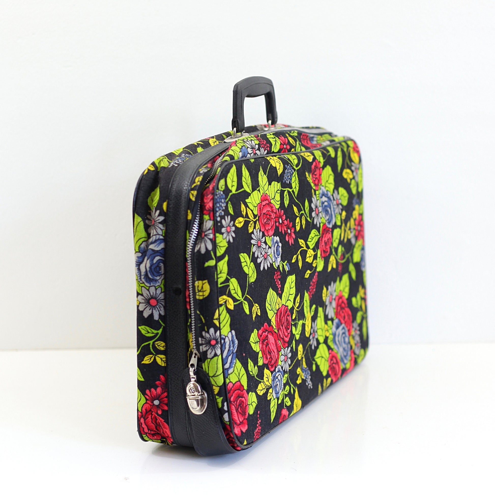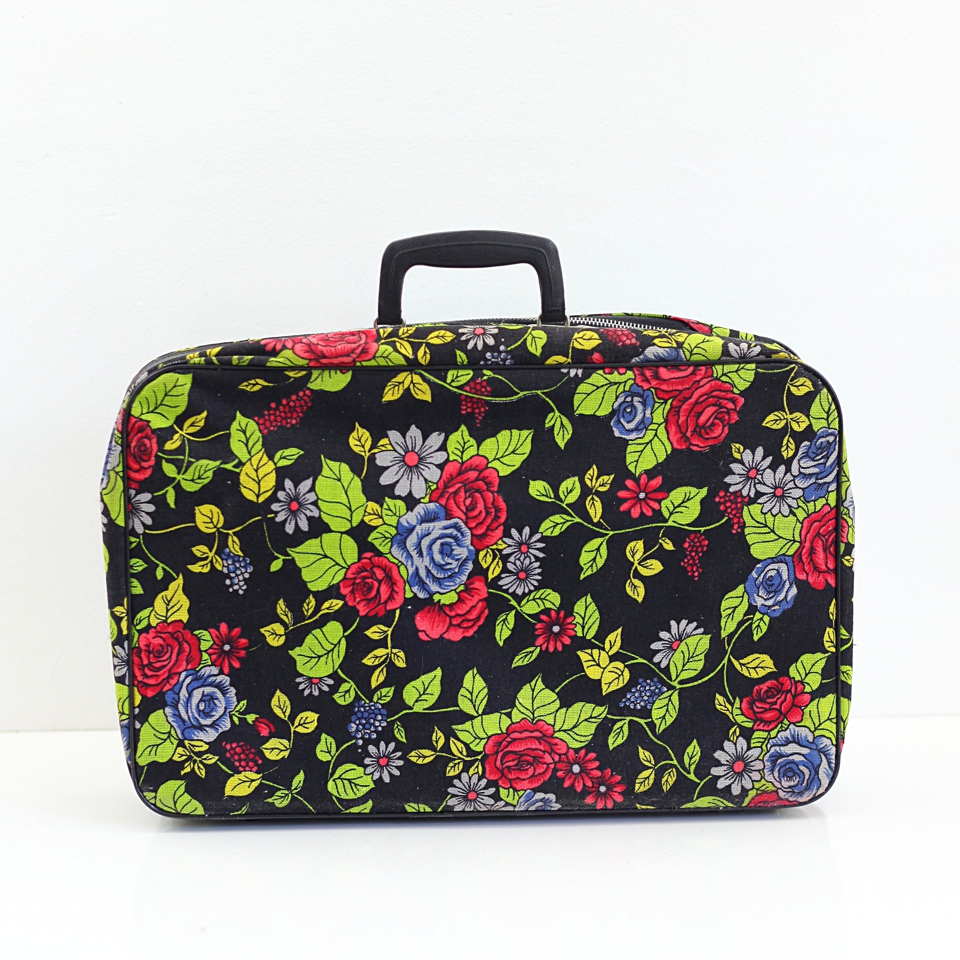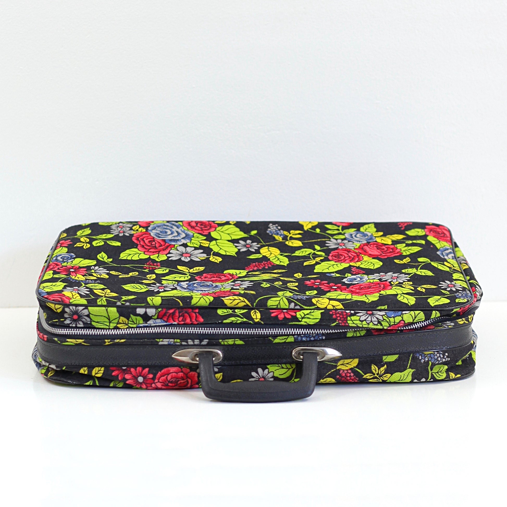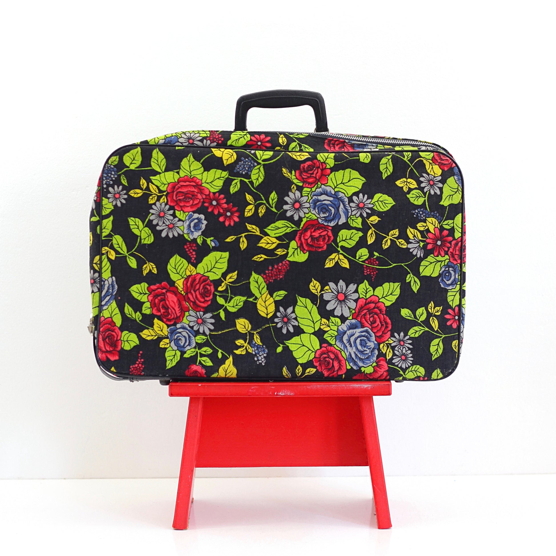 This fabulous vintage floral fabric suitcase is just so fun! Made of thick, sturdy canvas with an all-over rose pattern in rich, saturated hues of red, pink, green, and lilac. Lined with grey vinyl, this suitcase definitely puts the fun in functional!