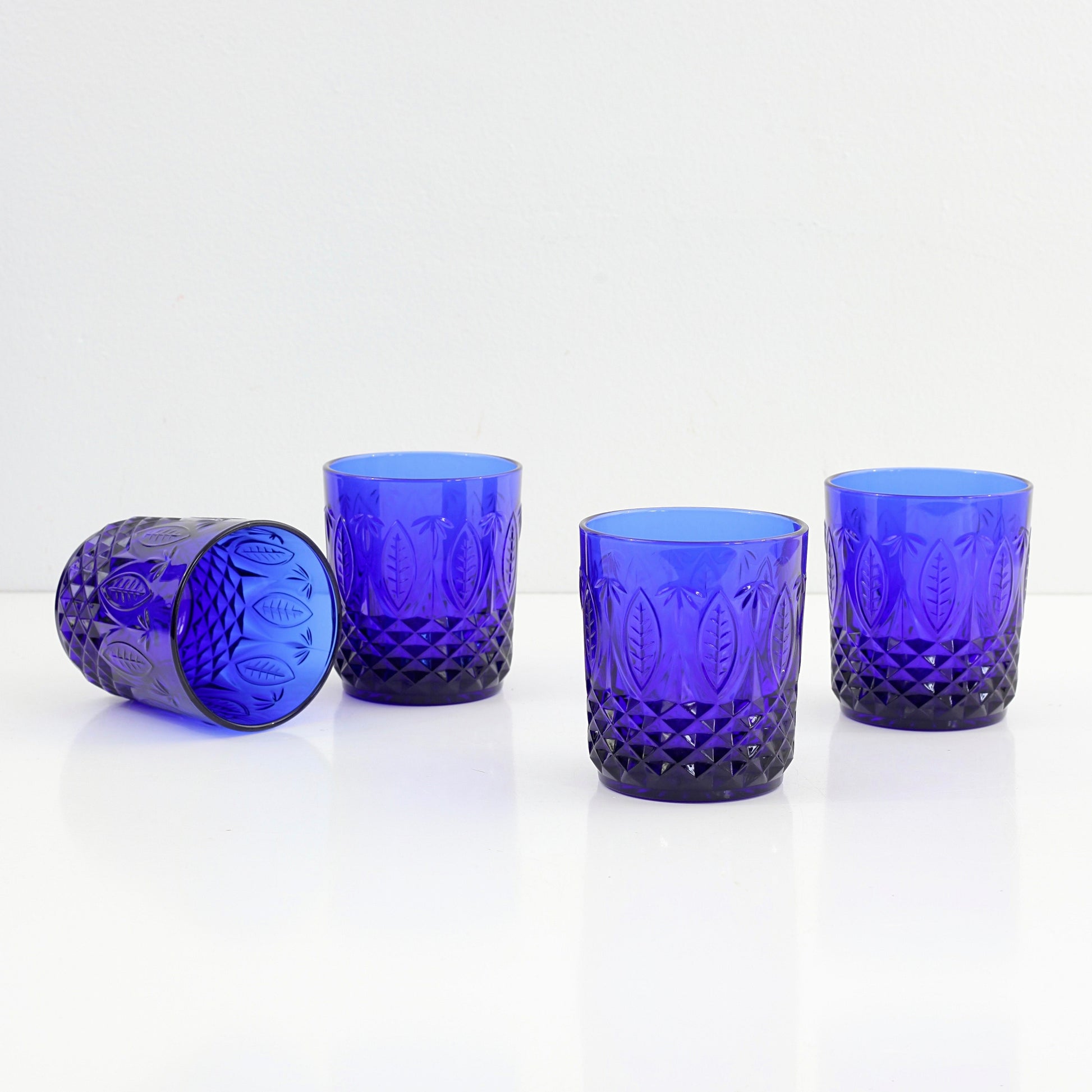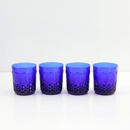 This gorgeous set of four vintage Royal Sapphire old fashioned glasses is absolutely stunning! Made in France for Avon, these pressed glass tumblers feature a textured geometric leaf design and have a nice heavy feel. Perfect for prettying up your kitchen table or shelves, and sure to make any drink extra special!