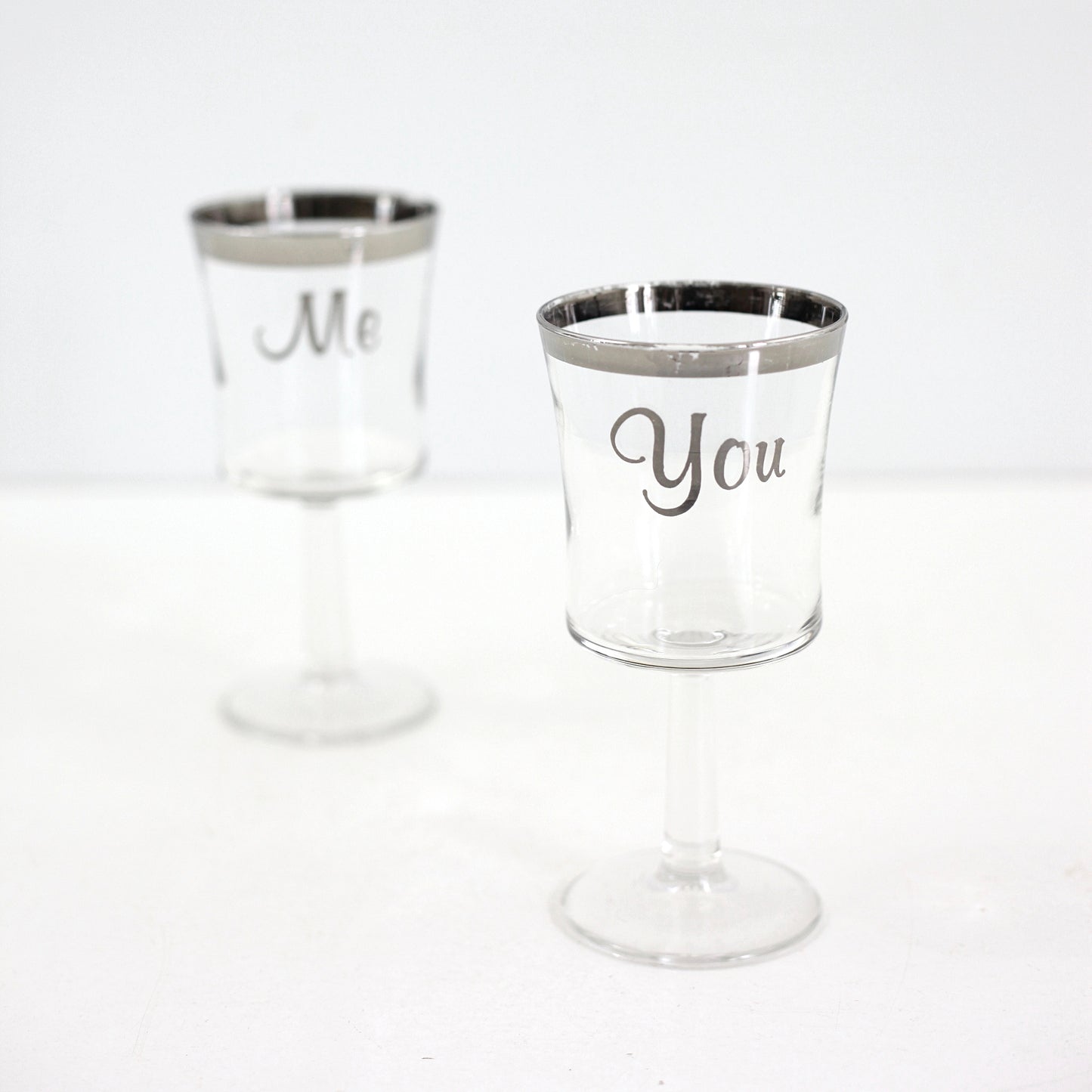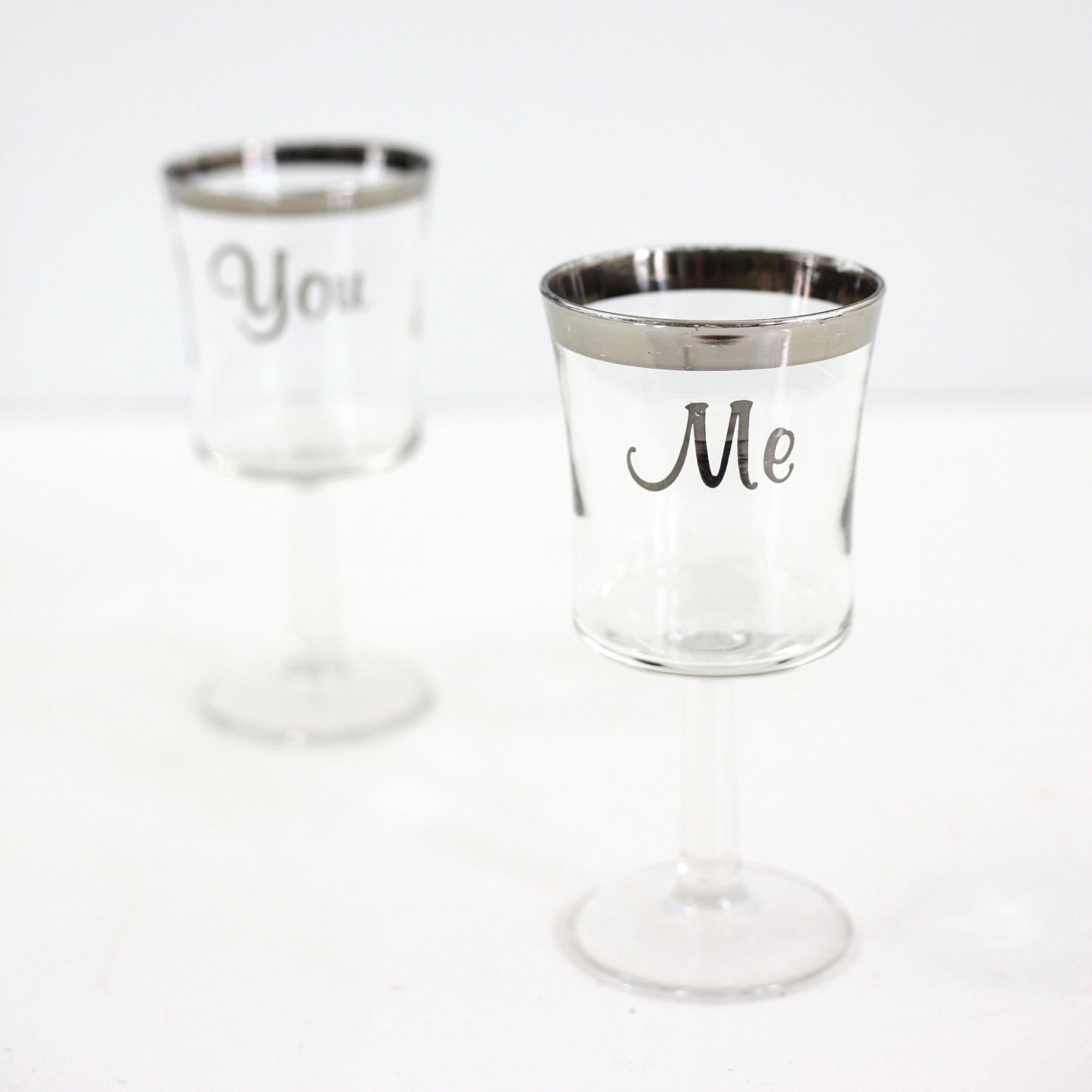 This fabulous pair of vintage silver rimmed 'you' and 'me' wine glasses is so sweet! Each glass has a classy silver band and gorgeous silver metallic script. Set includes two glasses shown. Perfect for drinks with your sweetie or a great gift for the newlyweds in your life!