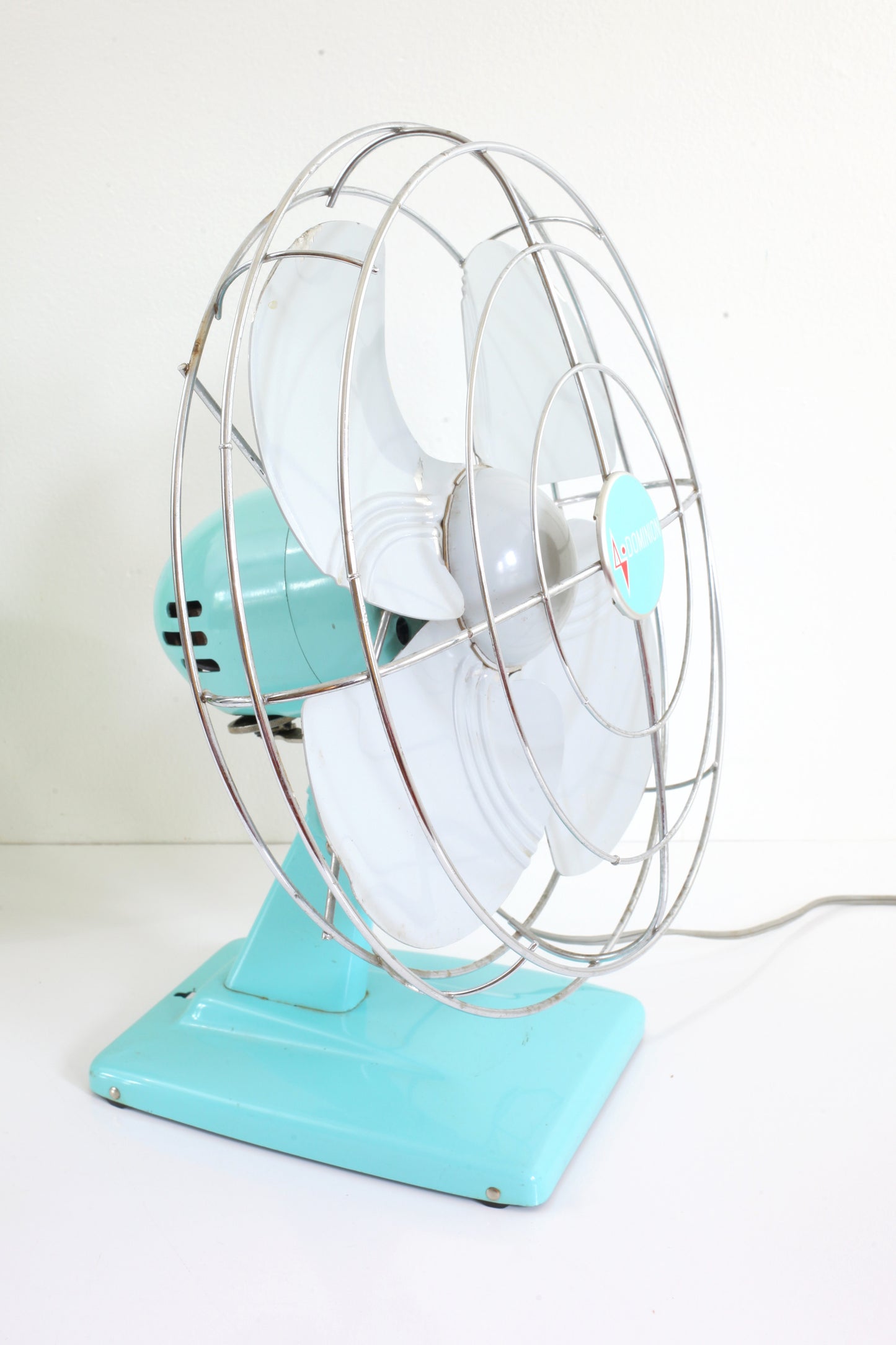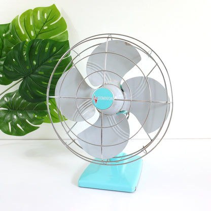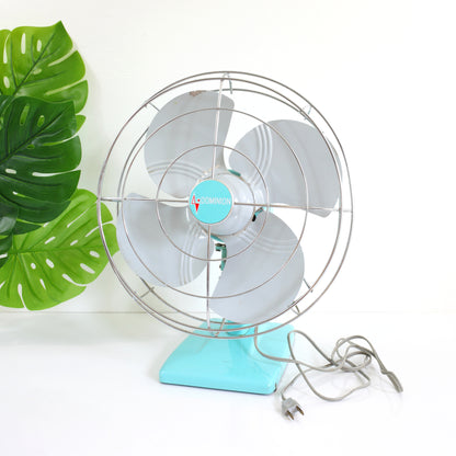 This gorgeous mid century Dominion electric fan is absolutely FAN-tastic! With a solid metal body in the loveliest shade of sky blue, a matching 'Dominion' logo in the center, a shiny silver metal cage, and a fabulous bright red switch, this breezy beauty is ready to cool you off and look good doing it.