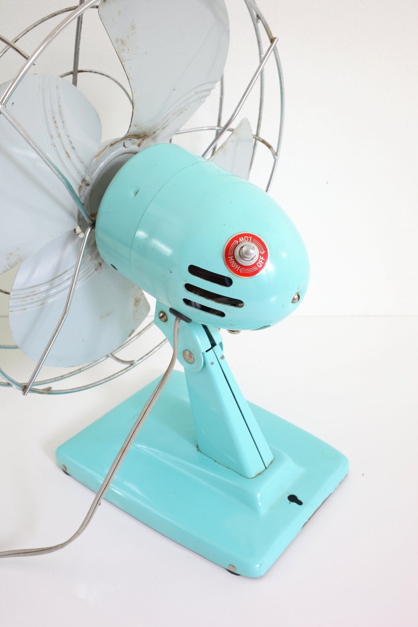 ➝ This fan is in wonderful condition for its age! Pushes out a good amount of air and has two different settings - high and low. Oscillating function does not work. Cord looks and feels sturdy and solid. One of the circular metal parts on the cage (second from the center) has detached from the cross bars, but the cage still feels very sturdy, and it's not noticeable unless you're looking for it (shown in last photo). A few dings and spots of paint loss on the blades of the fan, but overall, this beauty looks as good now as it did over sixty years ago!