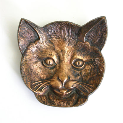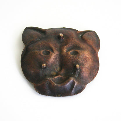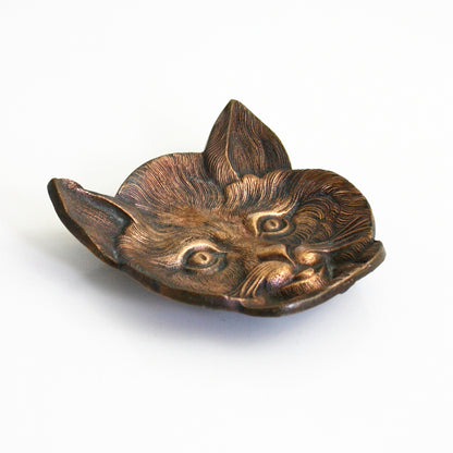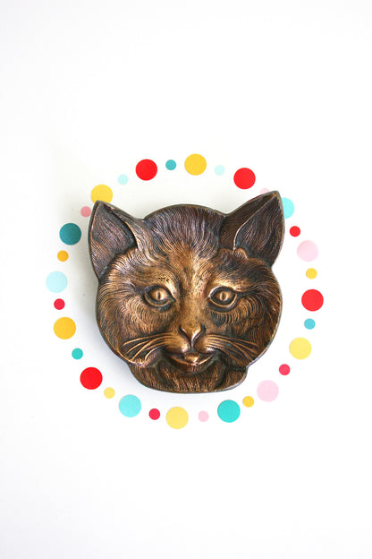 This beautiful vintage solid brass cat dish is so fun and unique! Made of solid cast brass, this little kitty has a rich and stunning patina, with an almost copper glow. Great details and a sturdy, heavy feel make this sweet little kitty extra special. Purr-fect for holding spare change, jewelry, or whatever you please!