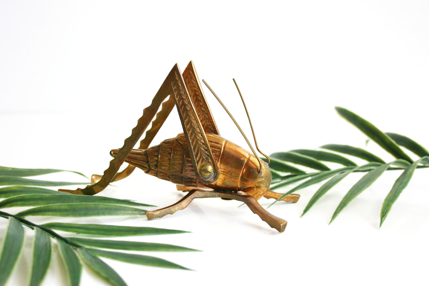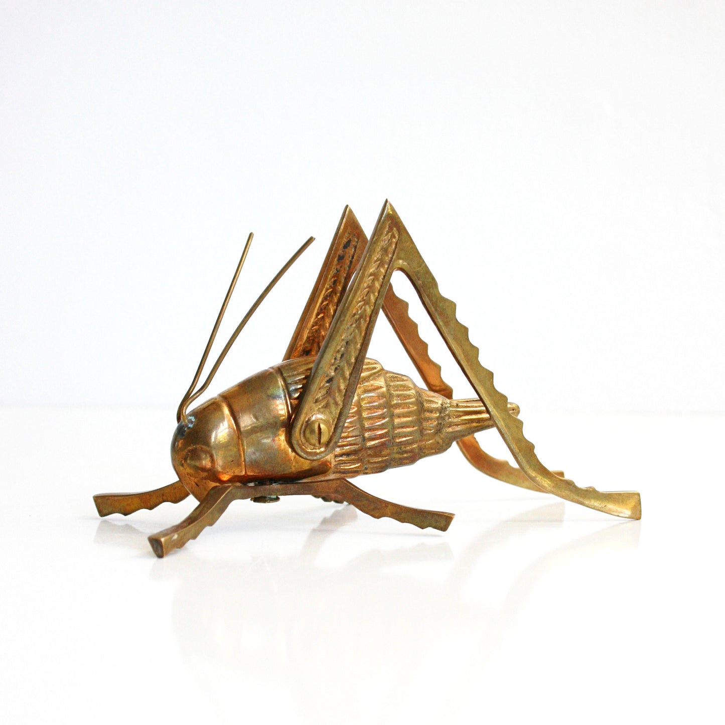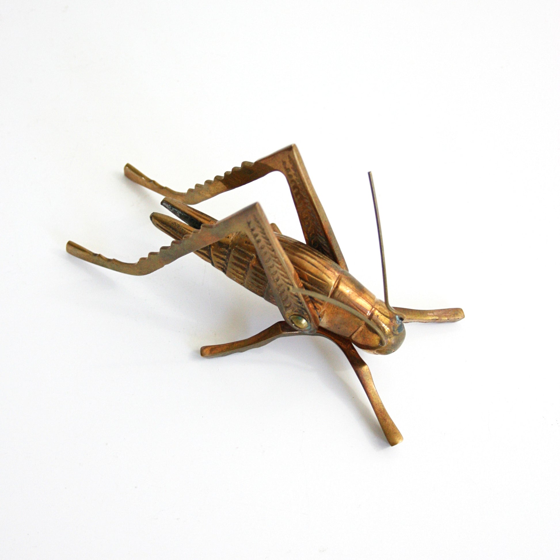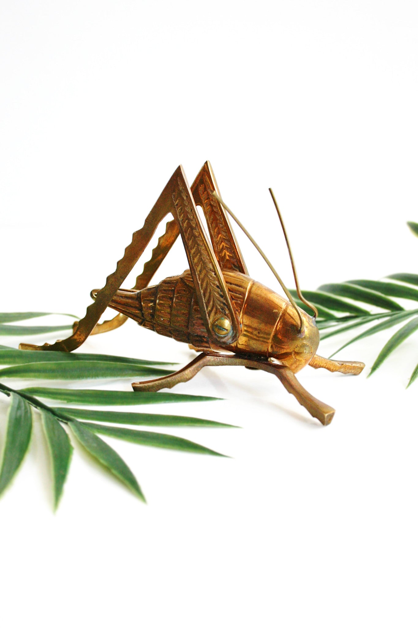 This gorgeous vintage solid brass grasshopper or cricket is so beautiful and unique! With a shiny golden patina and stunning details, this grasshopper makes a perfect paperweight, and is ready to decorate your desk or hop onto your bookshelf!