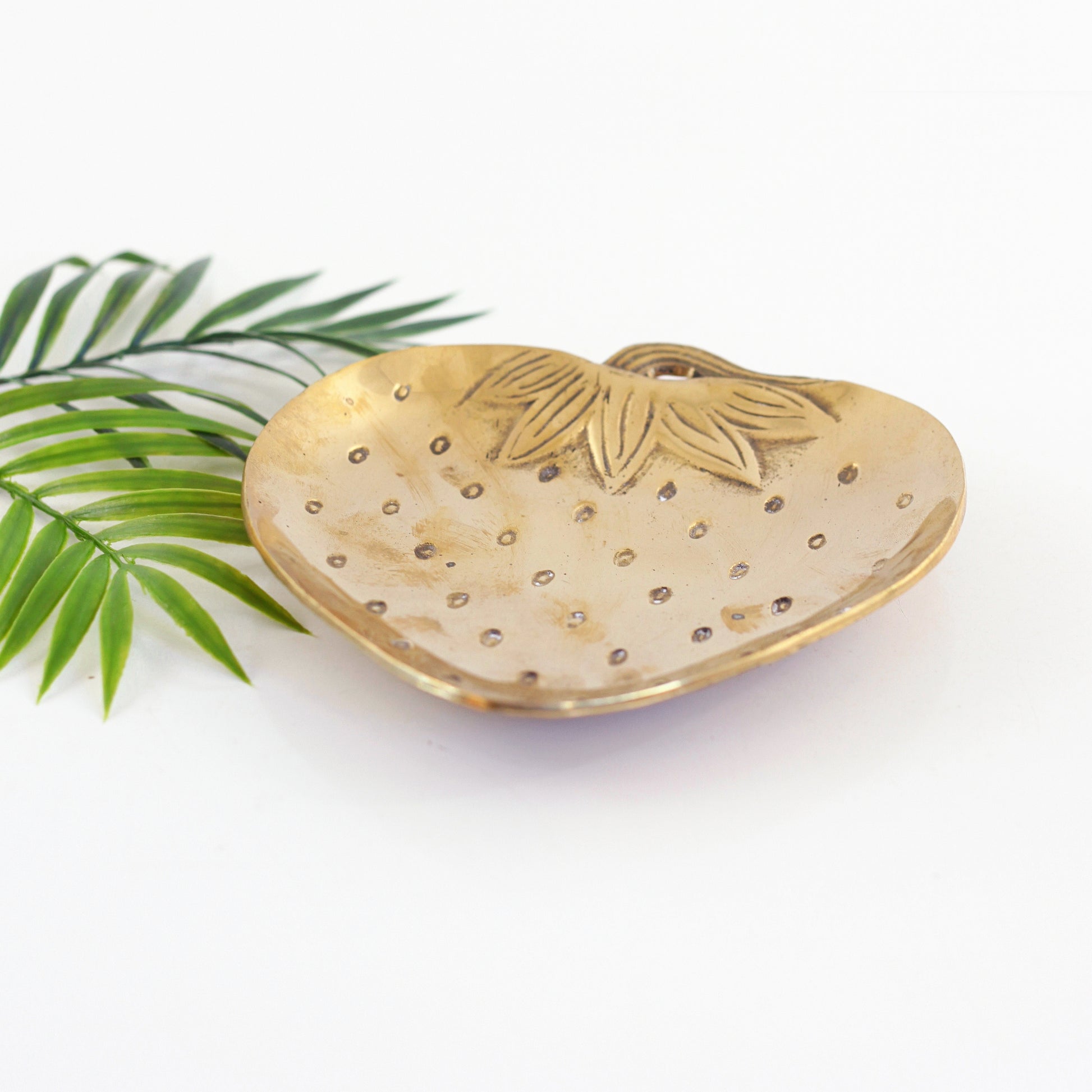 This beautiful vintage solid brass strawberry dish is so fun and unique! Made of solid cast brass, this beautiful brass berry has a rich and stunning patina, with a warm, golden glow. Great details and a sturdy, heavy feel make this dish extra special. I've been collecting vintage brass for years, and have never seen a dish anything like this one! Berry cute, indeed!