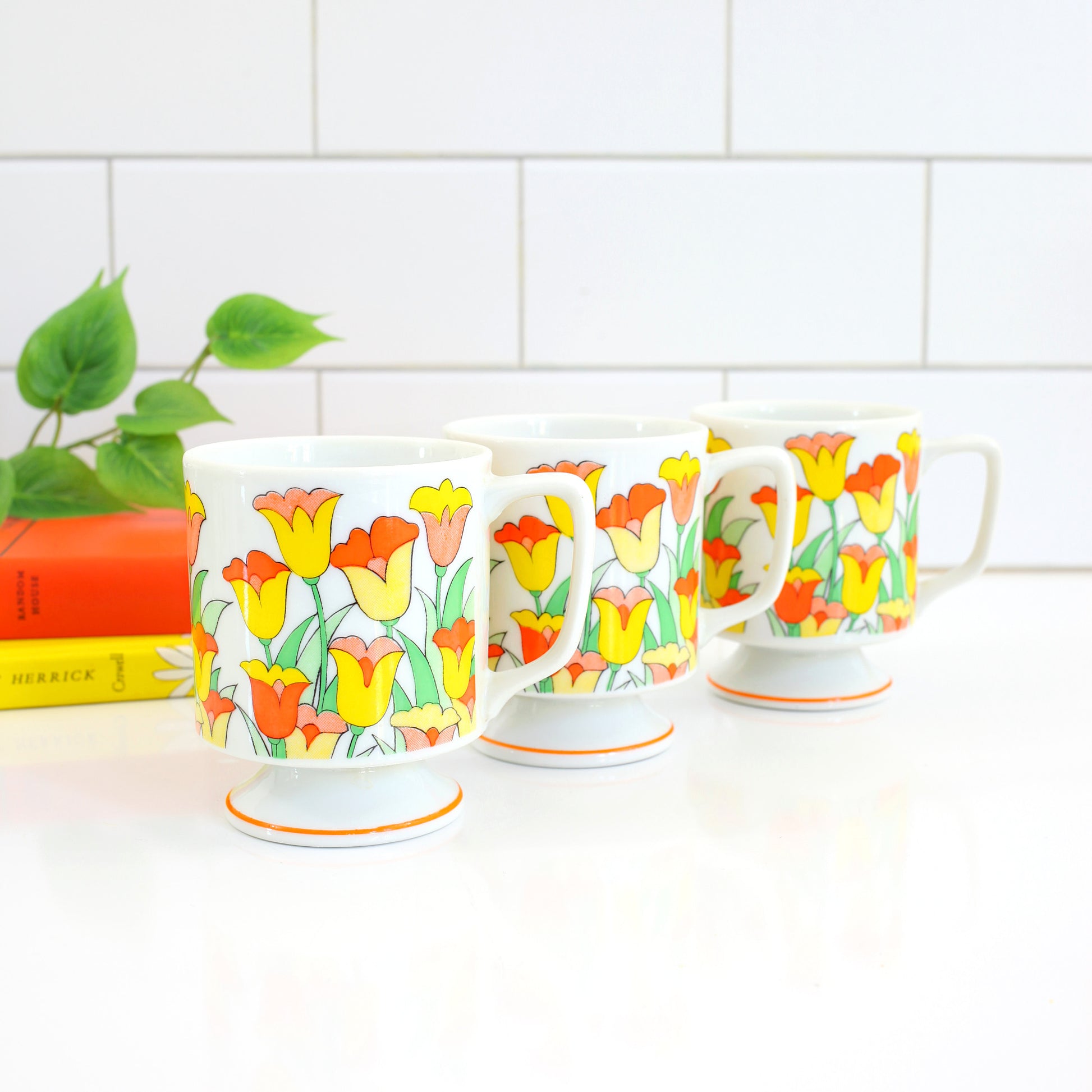These sweet vintage stacking flower mugs are so retro and fun! Made during the 1960s, this set of three colorful mugs has a classic retro pedestal shape and stack inside one another for easy storage. Bright white with a fun tulip pattern in orange, yellow, and green, these mugs are perfect for adding a bit of retro charm to your kitchen counter, and to your morning cup of coffee or tea - fill 'er up!