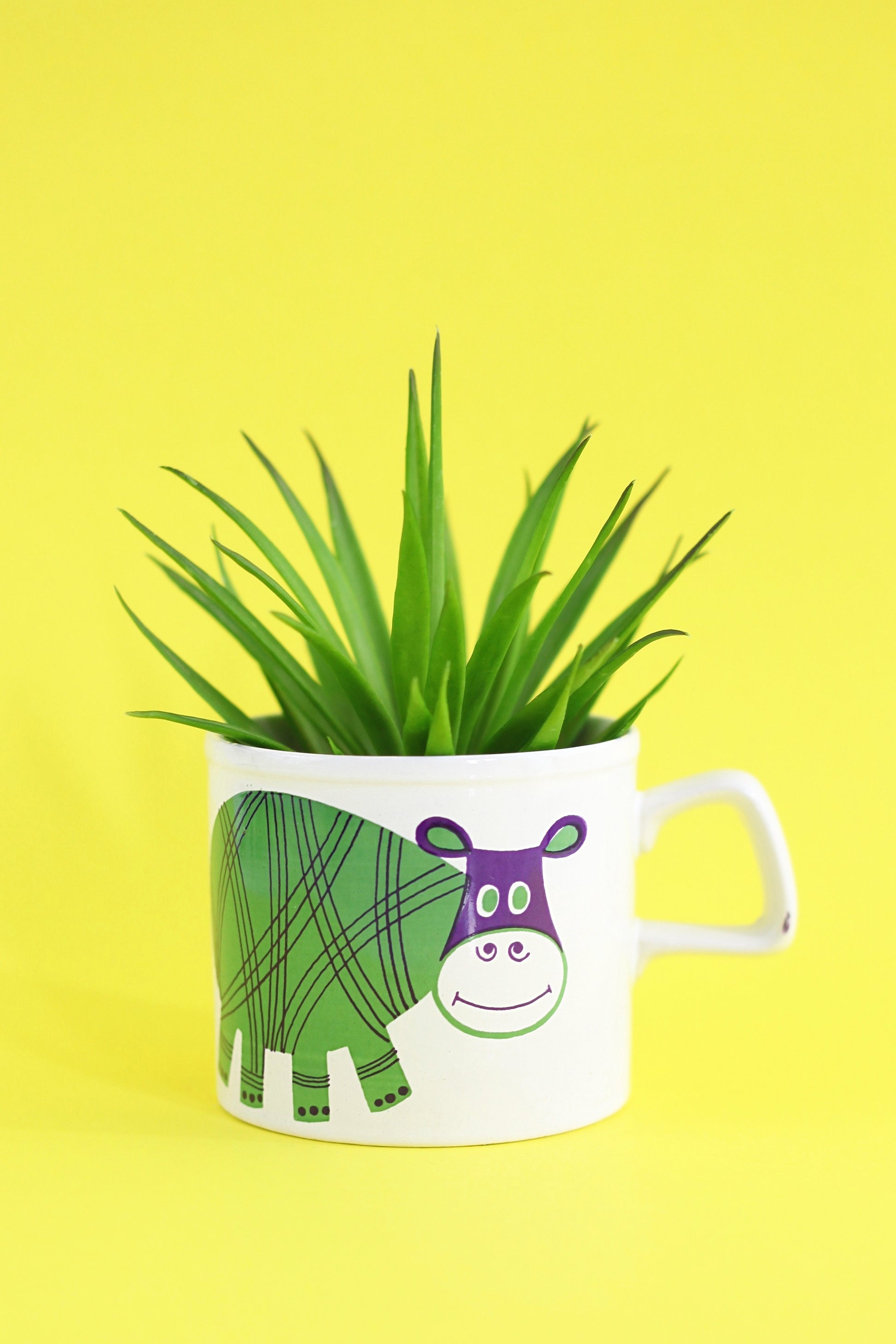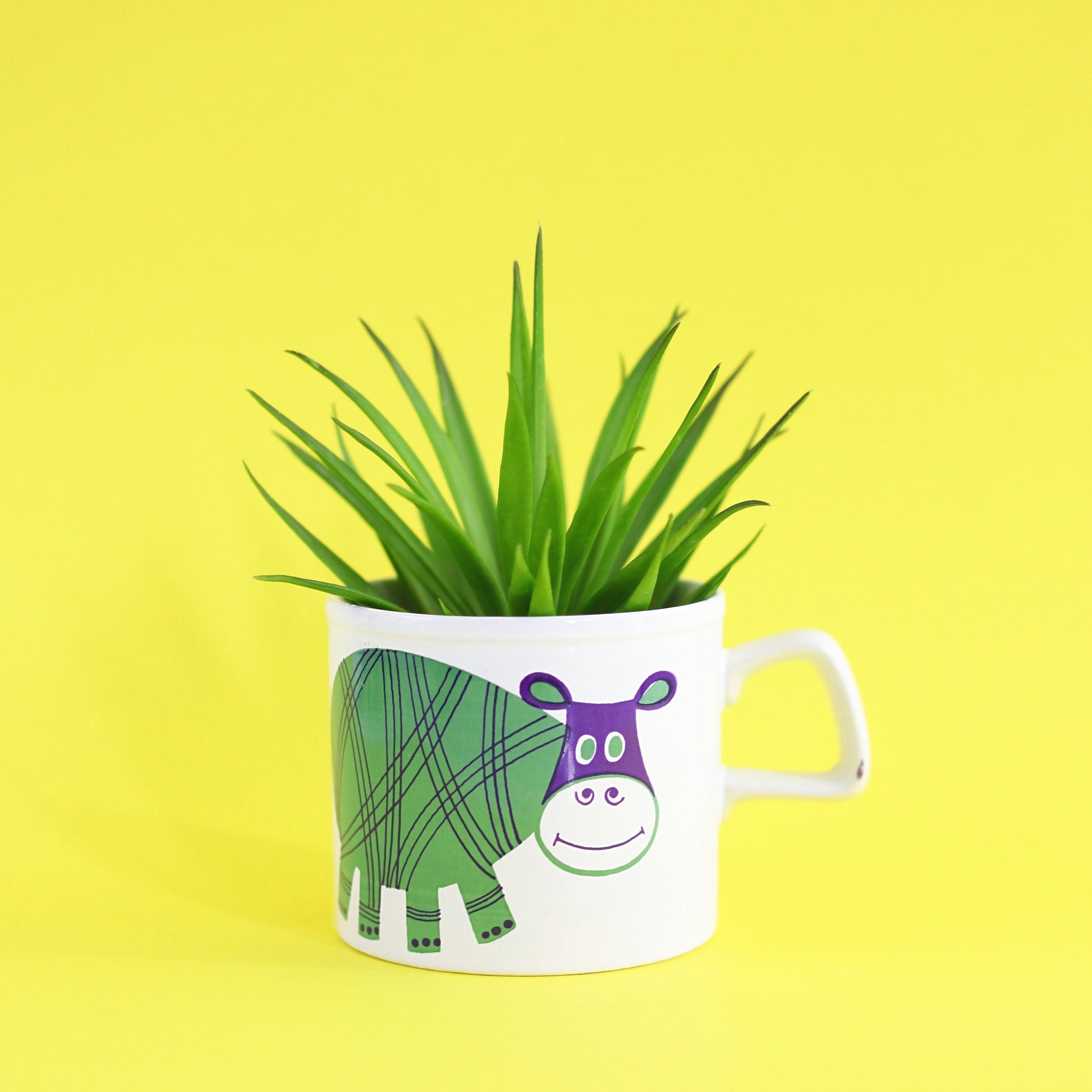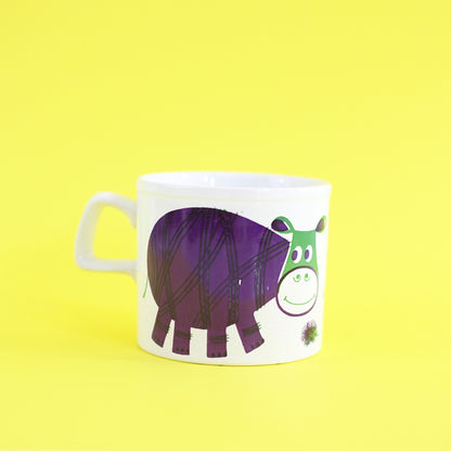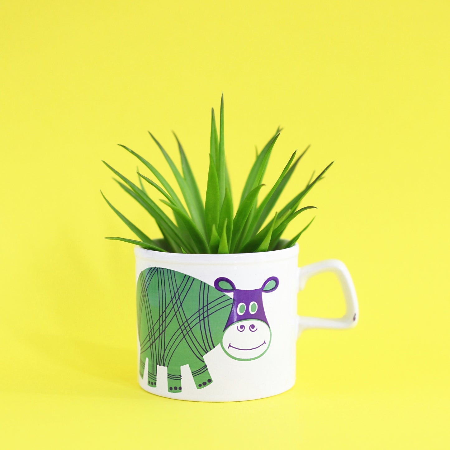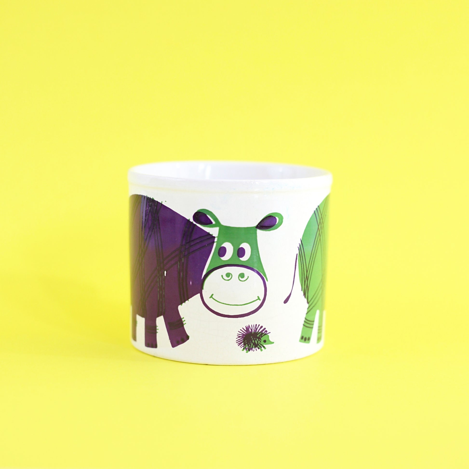 This fantastic vintage 1960s Staffordshire Potteries hippo mug is just so fun! A pair of hippos graces each side of this mug - one green, and one purple. A sweet little hedgehog hangs out between them! Perfect for sipping hot chocolate or coffee, and cute enough just to hold pens and pencils on your desk.