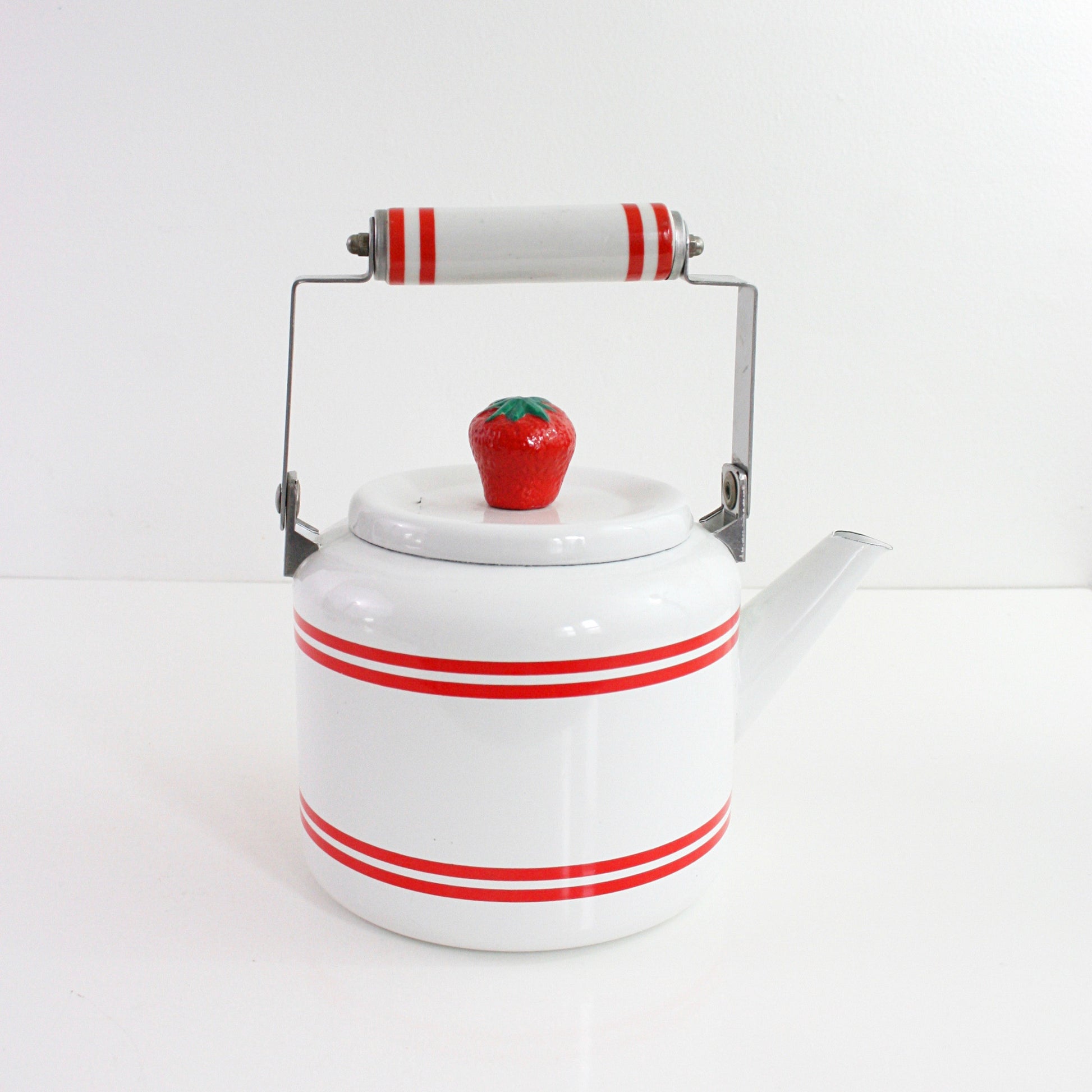The only thing better than a piping hot cup of your favorite coffee or tea is one poured from a fun vintage pot - and this vintage kettle is berry, berry cute! Made of sturdy enameled steel with a red and white ceramic handle and the sweetest strawberry handle, this beautiful vintage teapot is as cute as it is useful. A beautiful piece that's sure to bring a smile to your face and a pop of color to your kitchen!