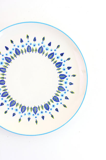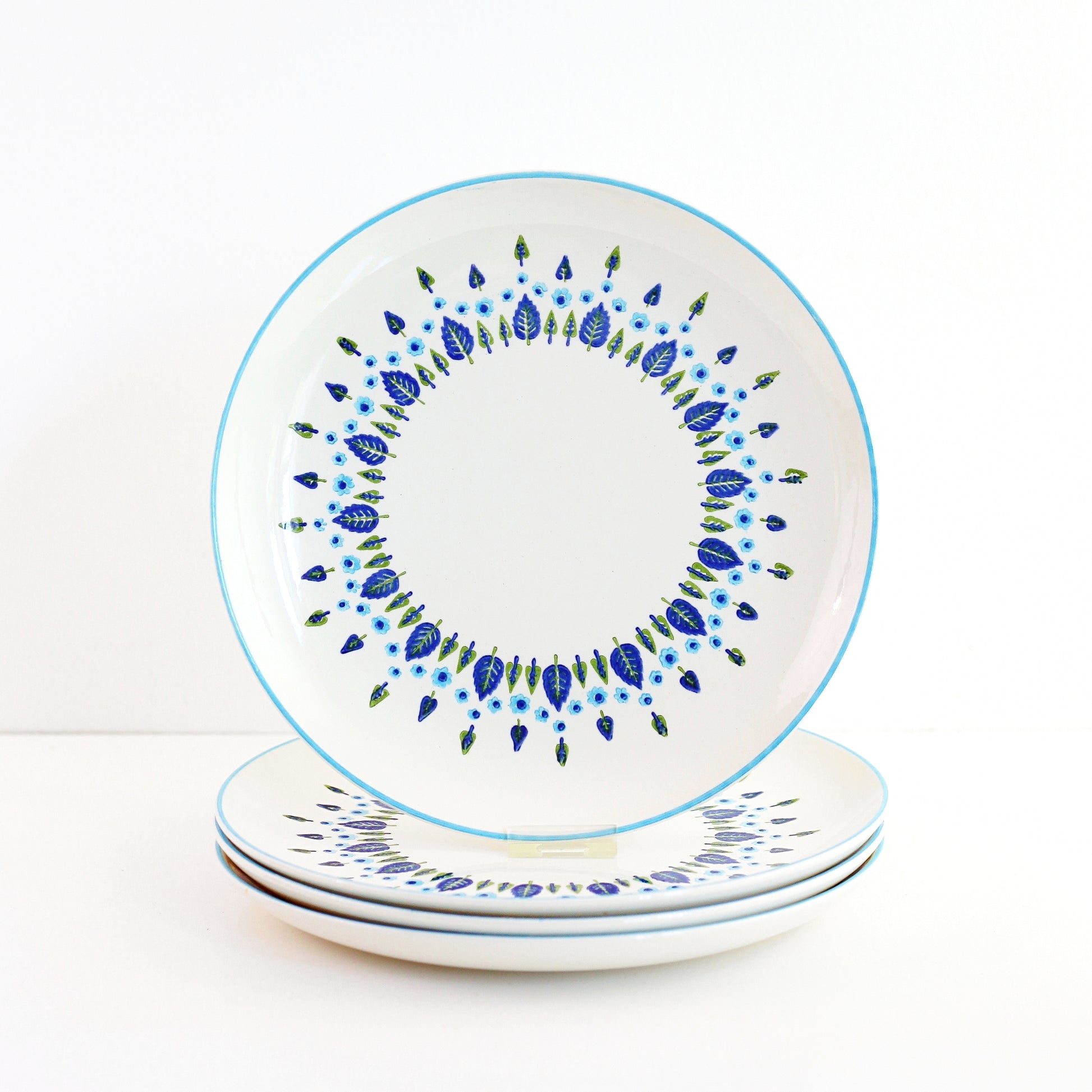 This lovely set of four dinner plates by Marcrest is in the Swiss Alpine or Swiss Chalet design, which consists of sweet little leaves, trees, and flowers. In super retro shades of aqua blue, cobalt and green, these plates are such a great example of mid century dinnerware! The perfect way to make any meal extra special!
