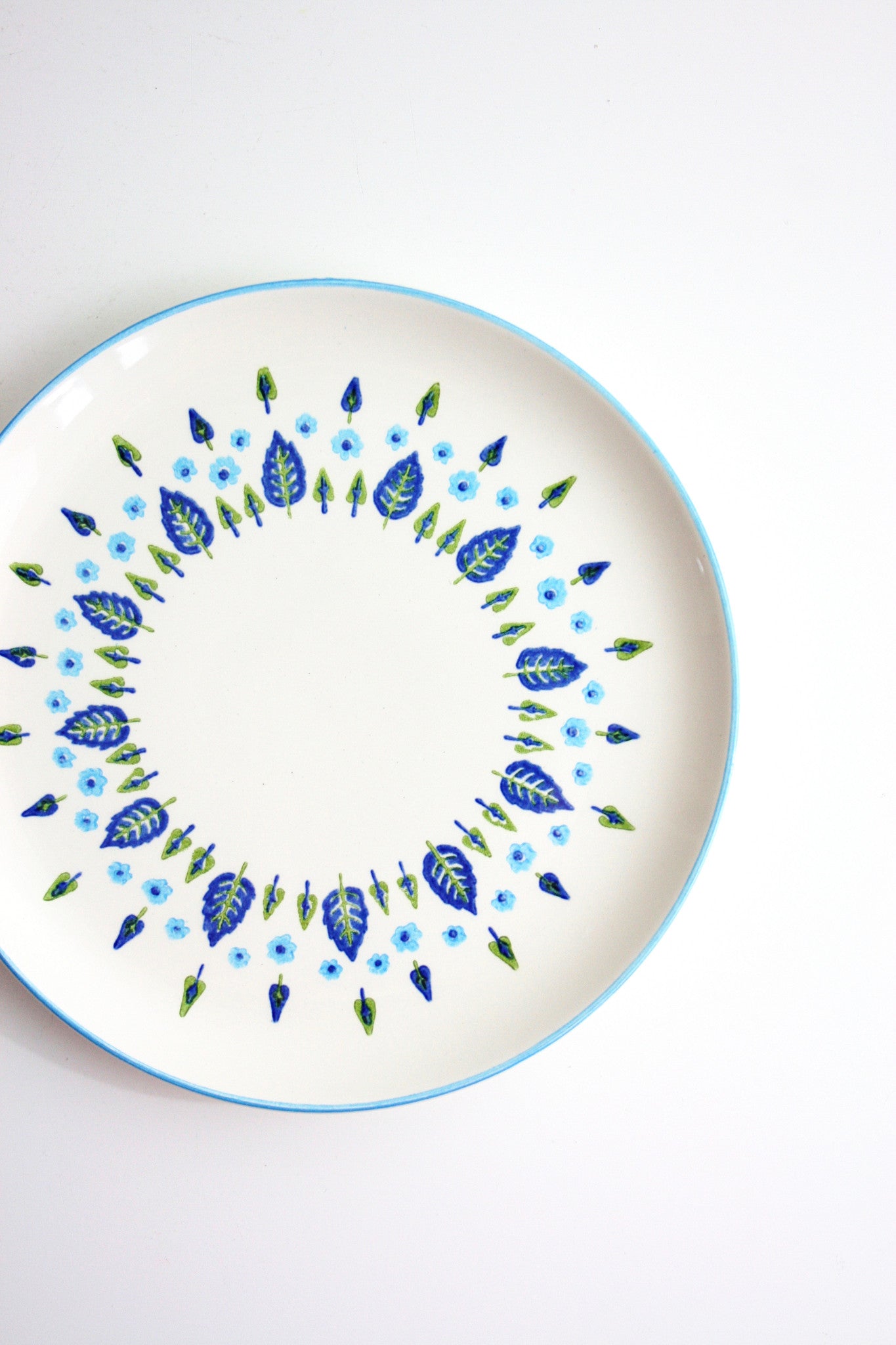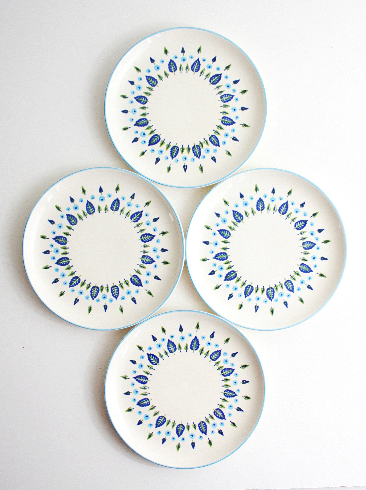 This lovely set of four lunch plates by Marcrest is in the Swiss Alpine or Swiss Chalet design, which consists of sweet little leaves, trees, and flowers. In super retro shades of aqua blue, cobalt and green, these hard-to-find plates are such a great example of mid century dinnerware!