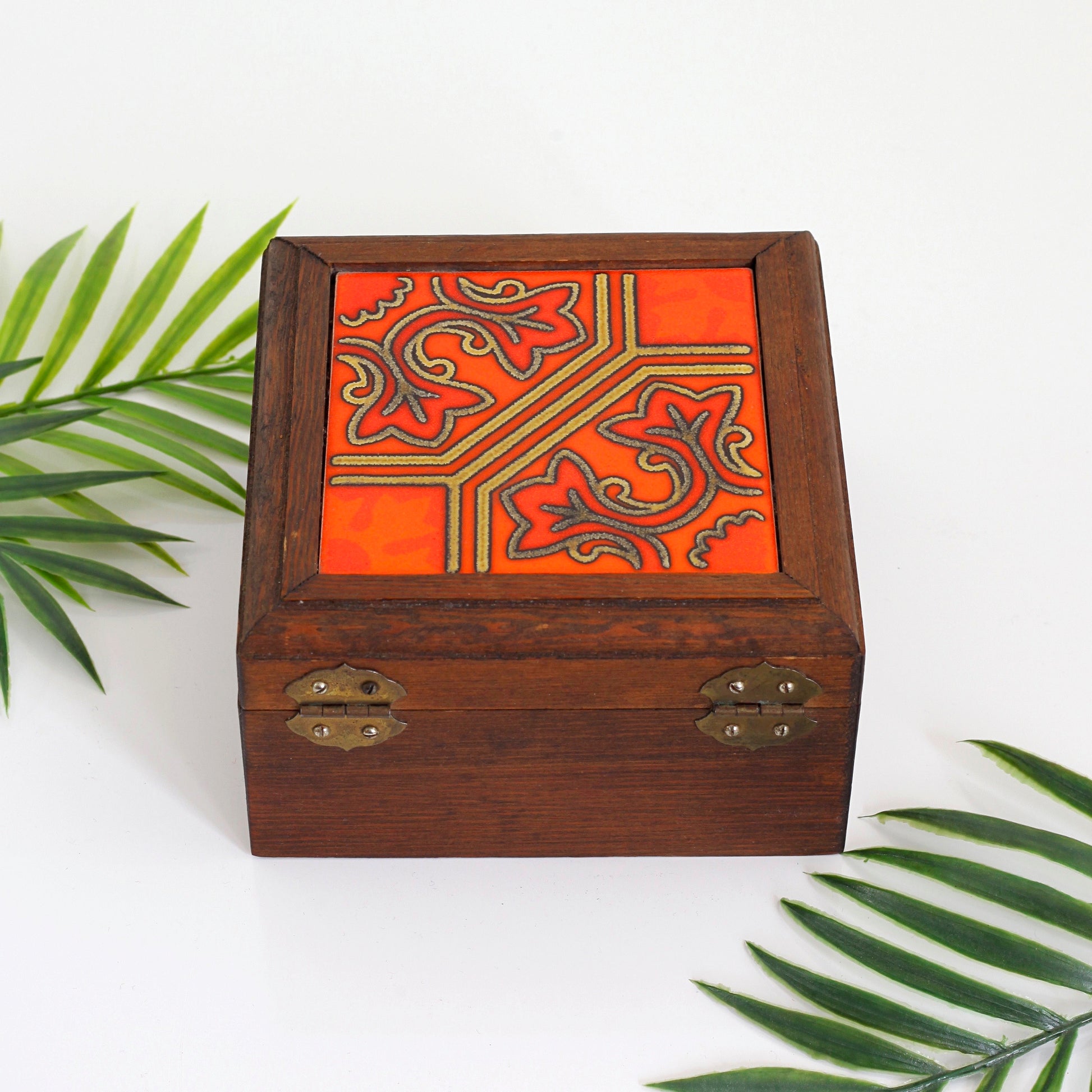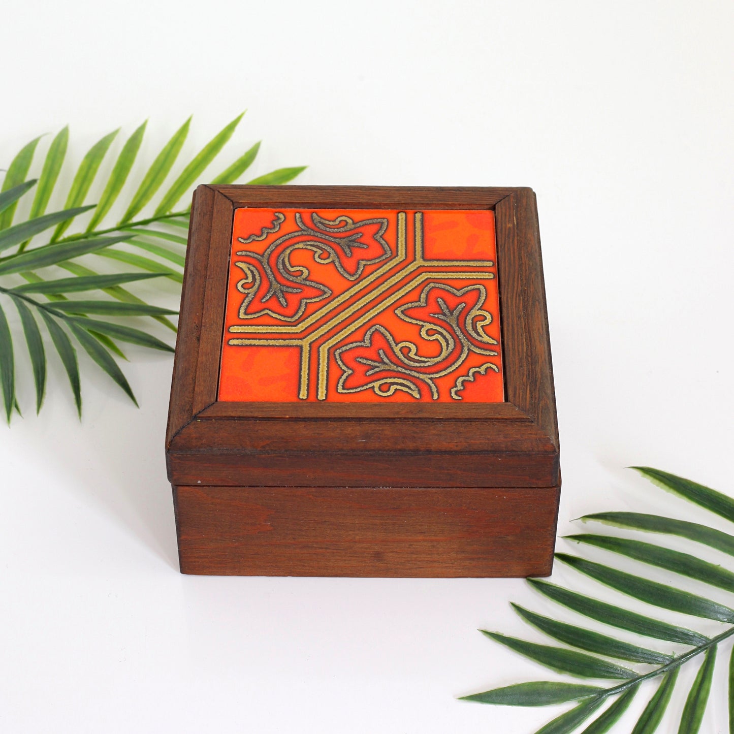 This absolutely gorgeous wood and tile trinket box is just so charming! Made of solid wood with a beautiful wood grain, this little treasure box is as beautiful as it is useful. The lid features a gorgeous ceramic tile in a rich, saturated red-orange. Makes a great jewelry box, office supply organizer, or whatever you please!