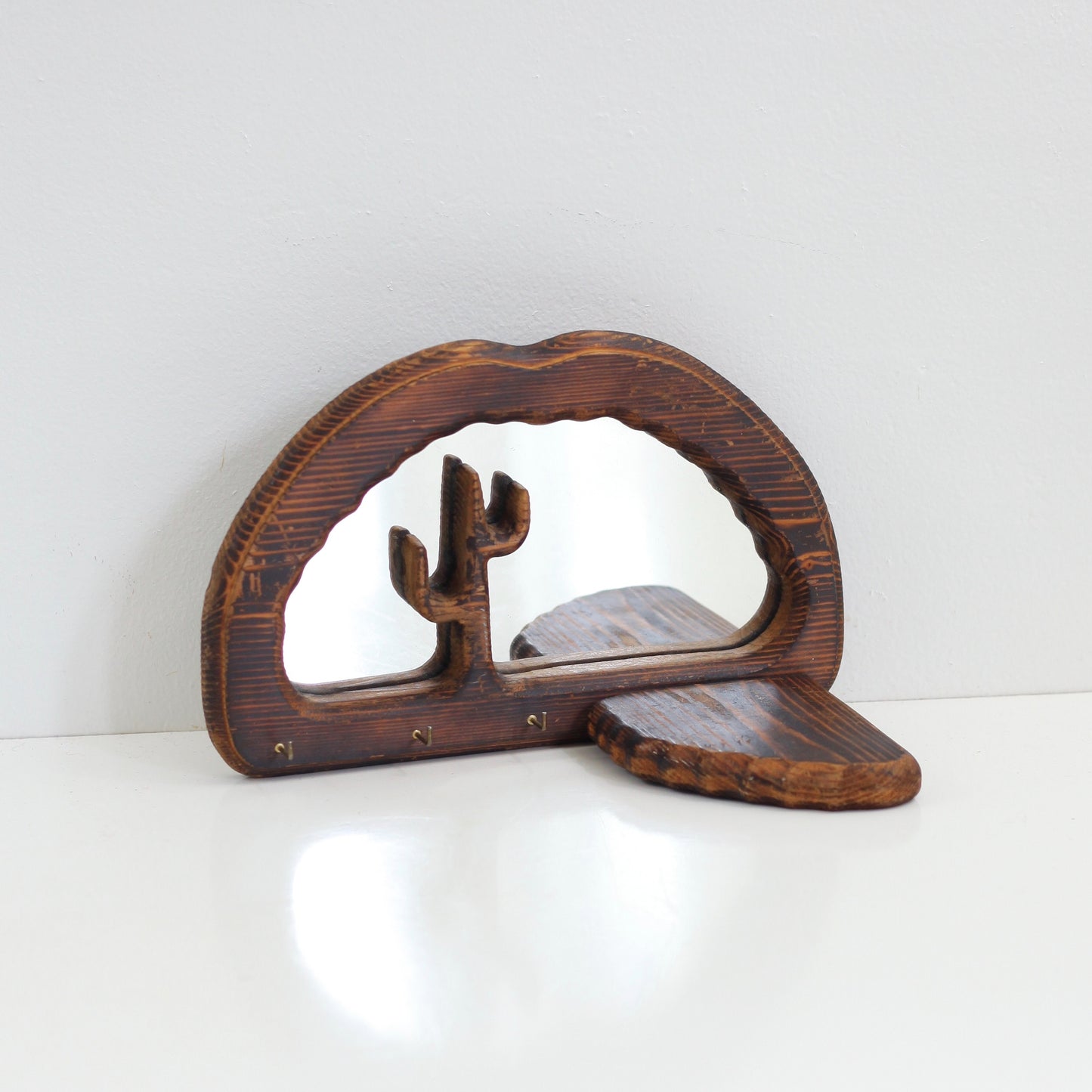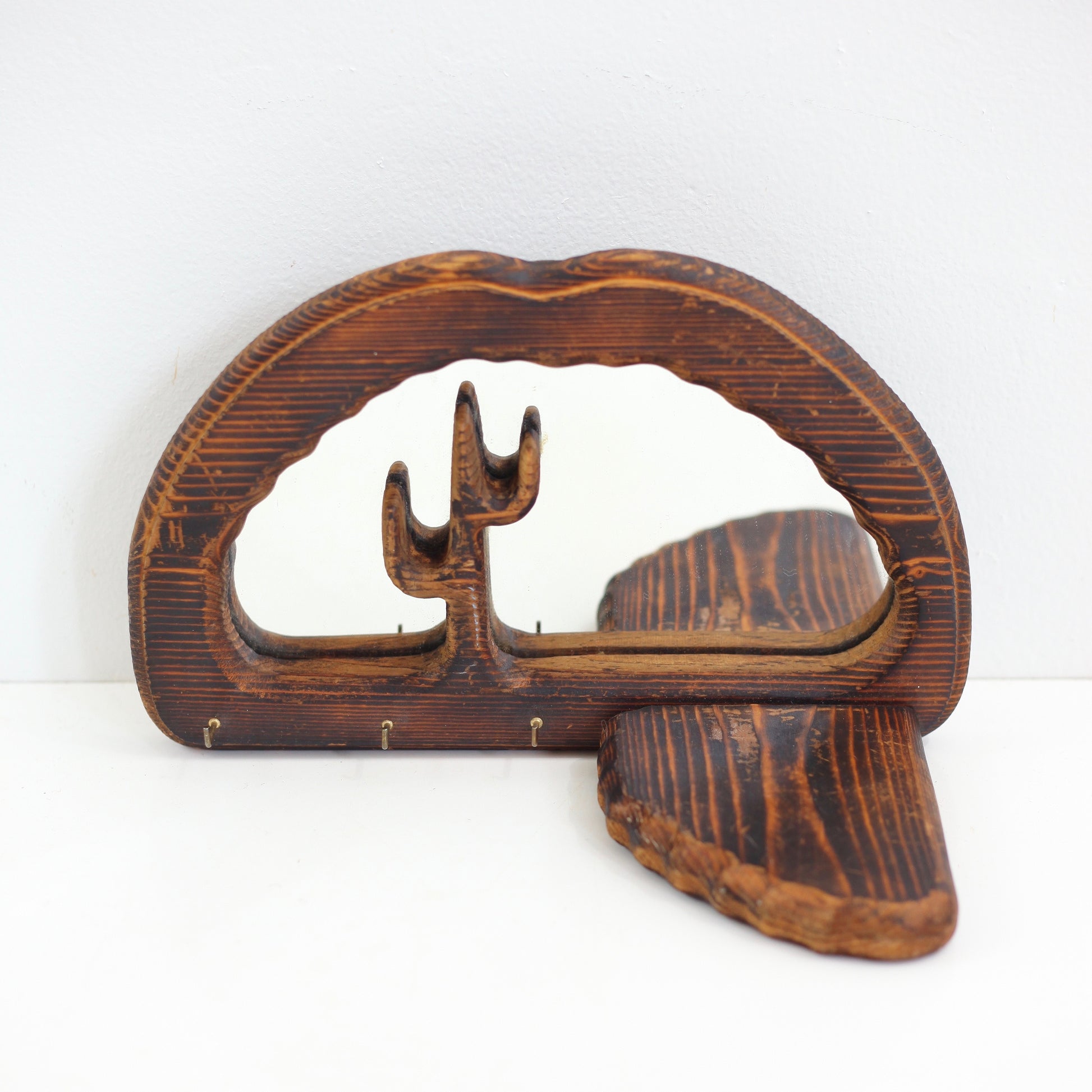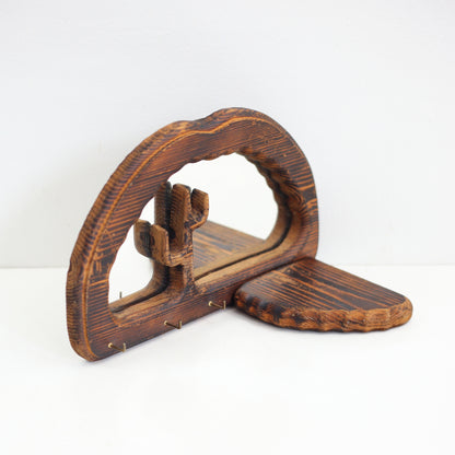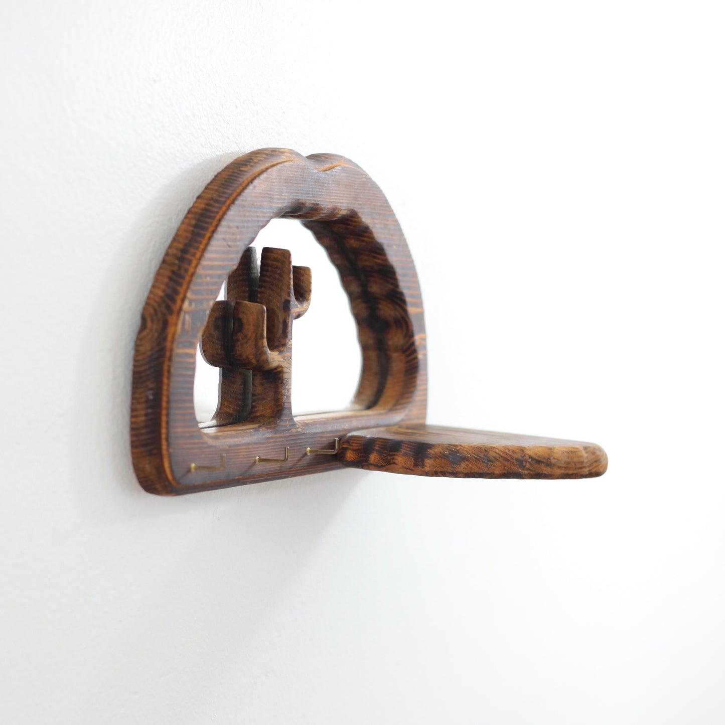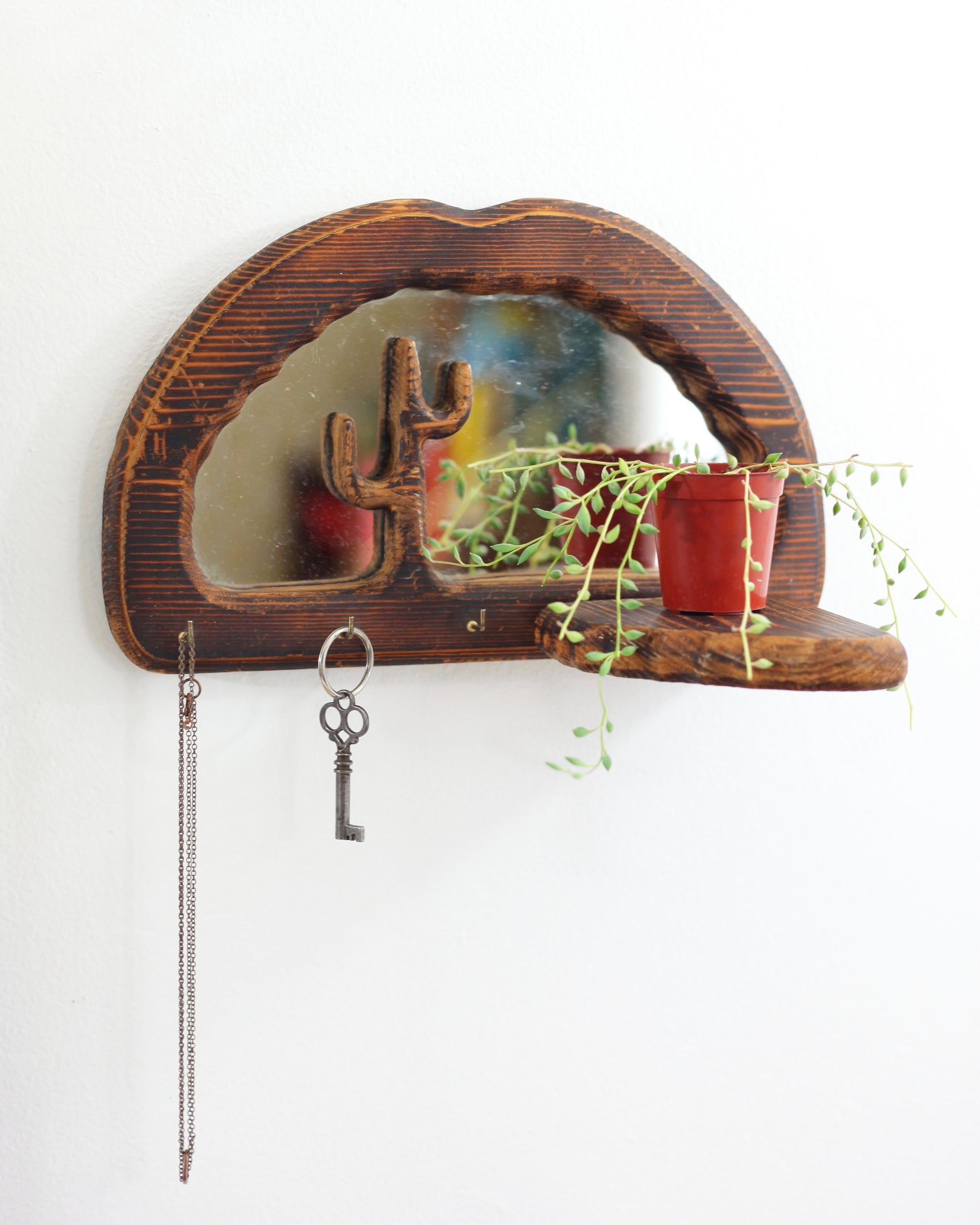 This vintage carved wood wall organizer is just gorgeous! Made of solid wood with a beautiful wood grain, this wall organizer has a mirror, three brass hooks, and a small shelf (the perfect size for a wee succulent or cactus!). I especially love the carved wood cactus that's part of the wood frame! A metal hook on the back makes it easy to mount on the wall. A gorgeous piece with tons of vintage charm, this wooden organizer is perfect for holding keys in your entryway, jewelry in your bedroom, or whatever you please!