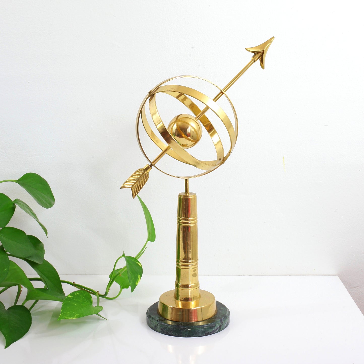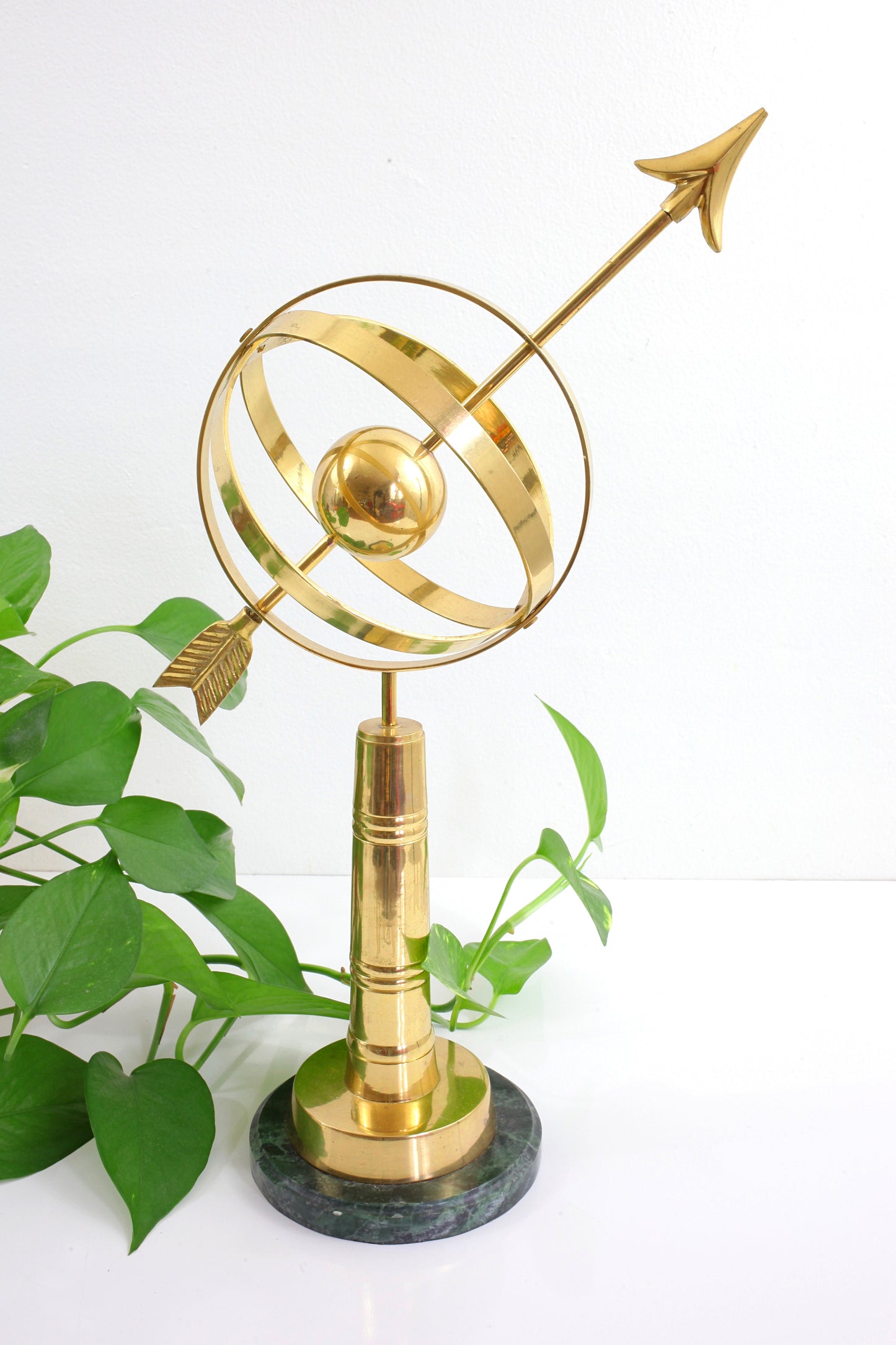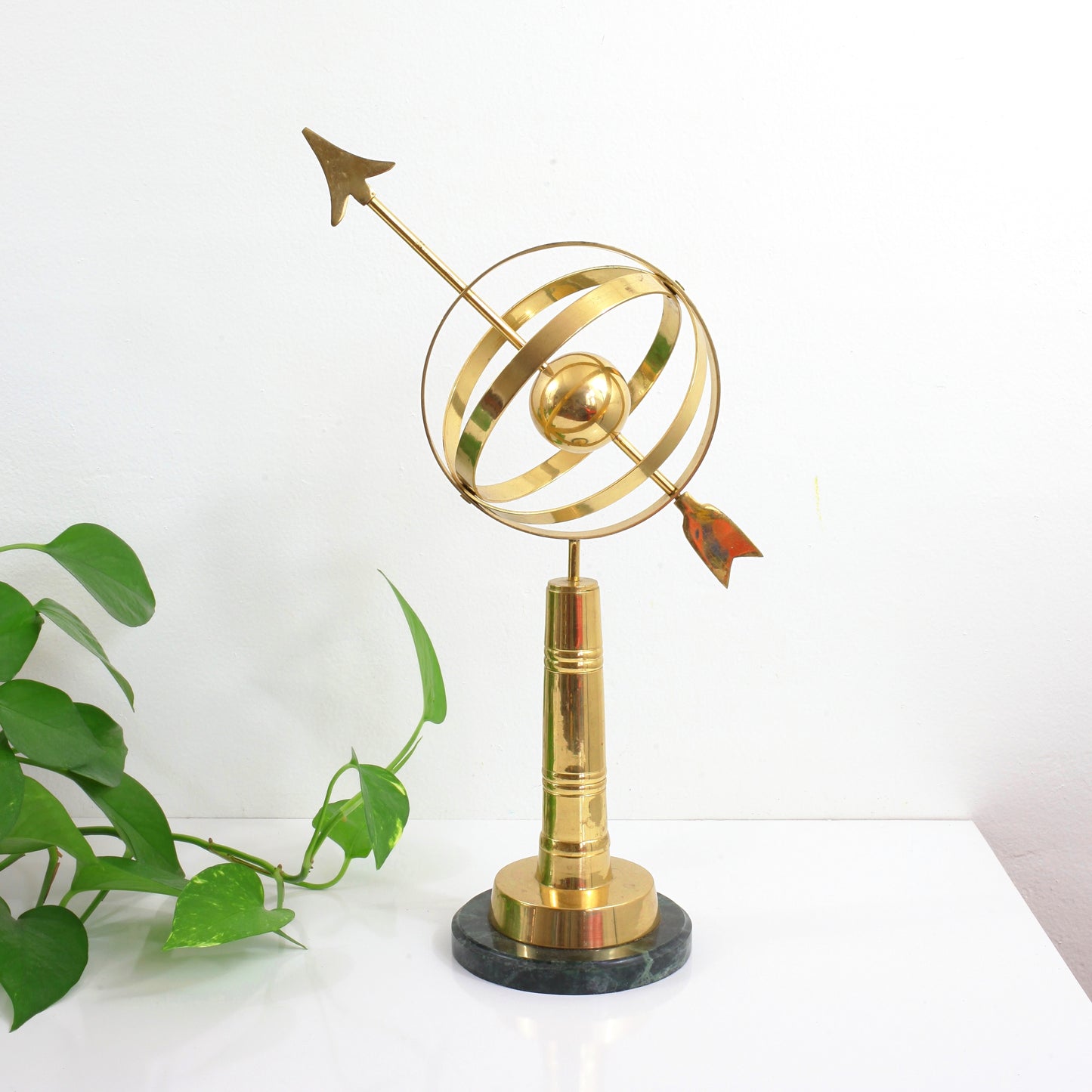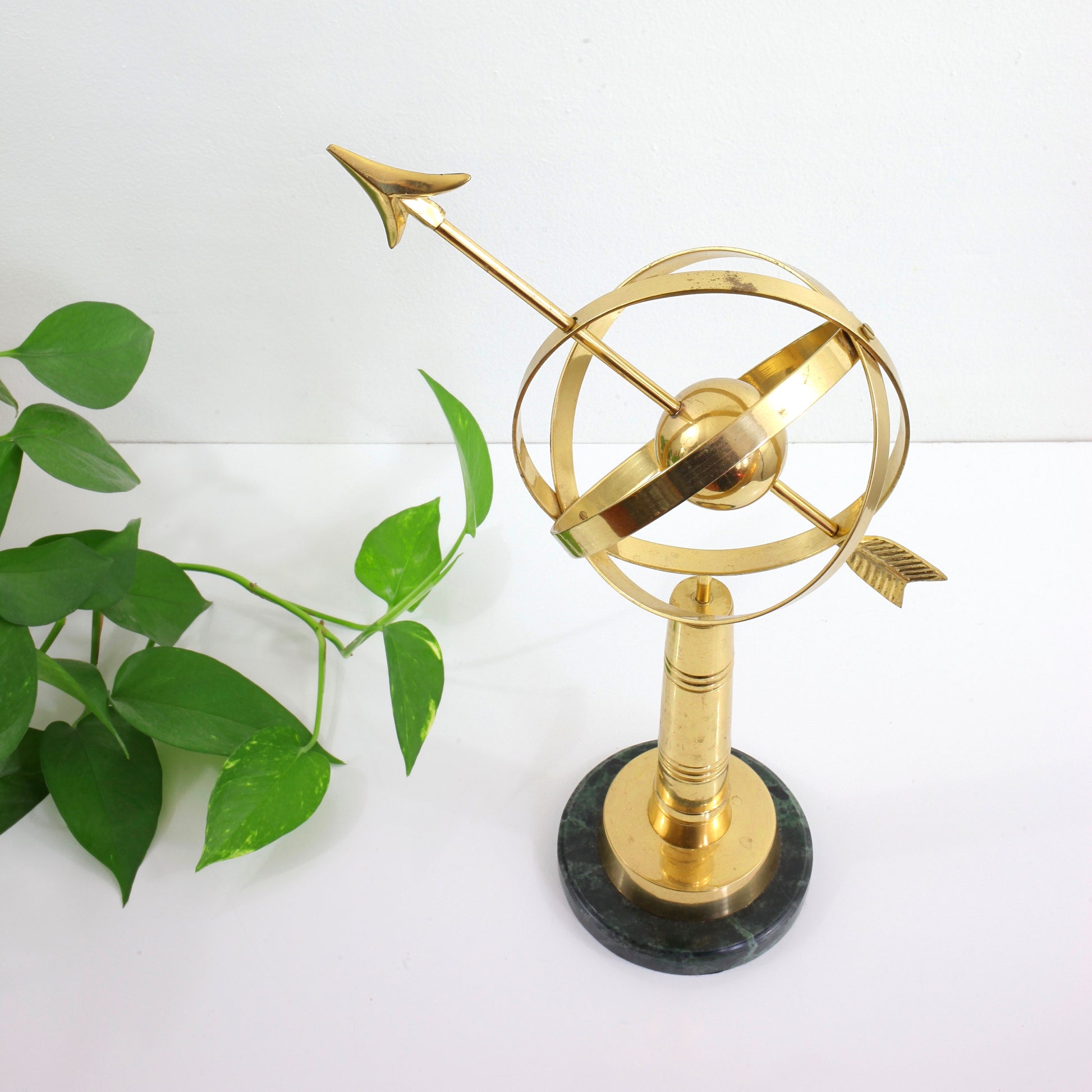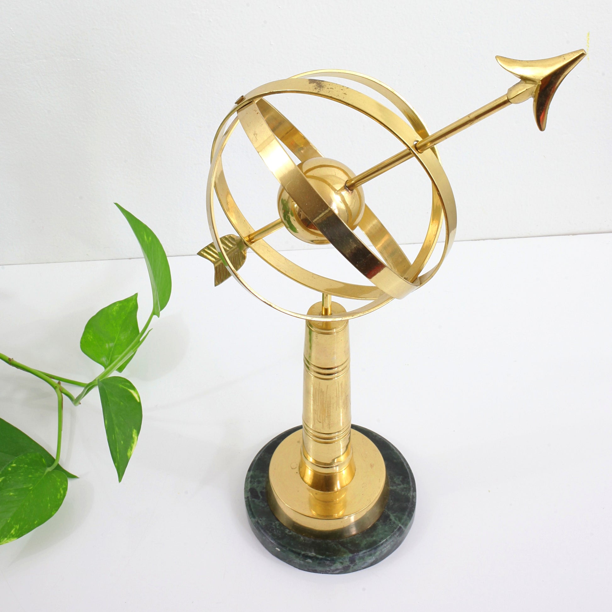 This beautiful vintage brass and marble armillary sphere is truly out of this world! Made of lacquered brass with a gorgeous golden shine, this extra large armillary globe sits atop a green marble base. Bottom of marble base is lined with velvet to protect your surfaces. This vintage beauty is sure to be the star of your desk, library, or shelf!